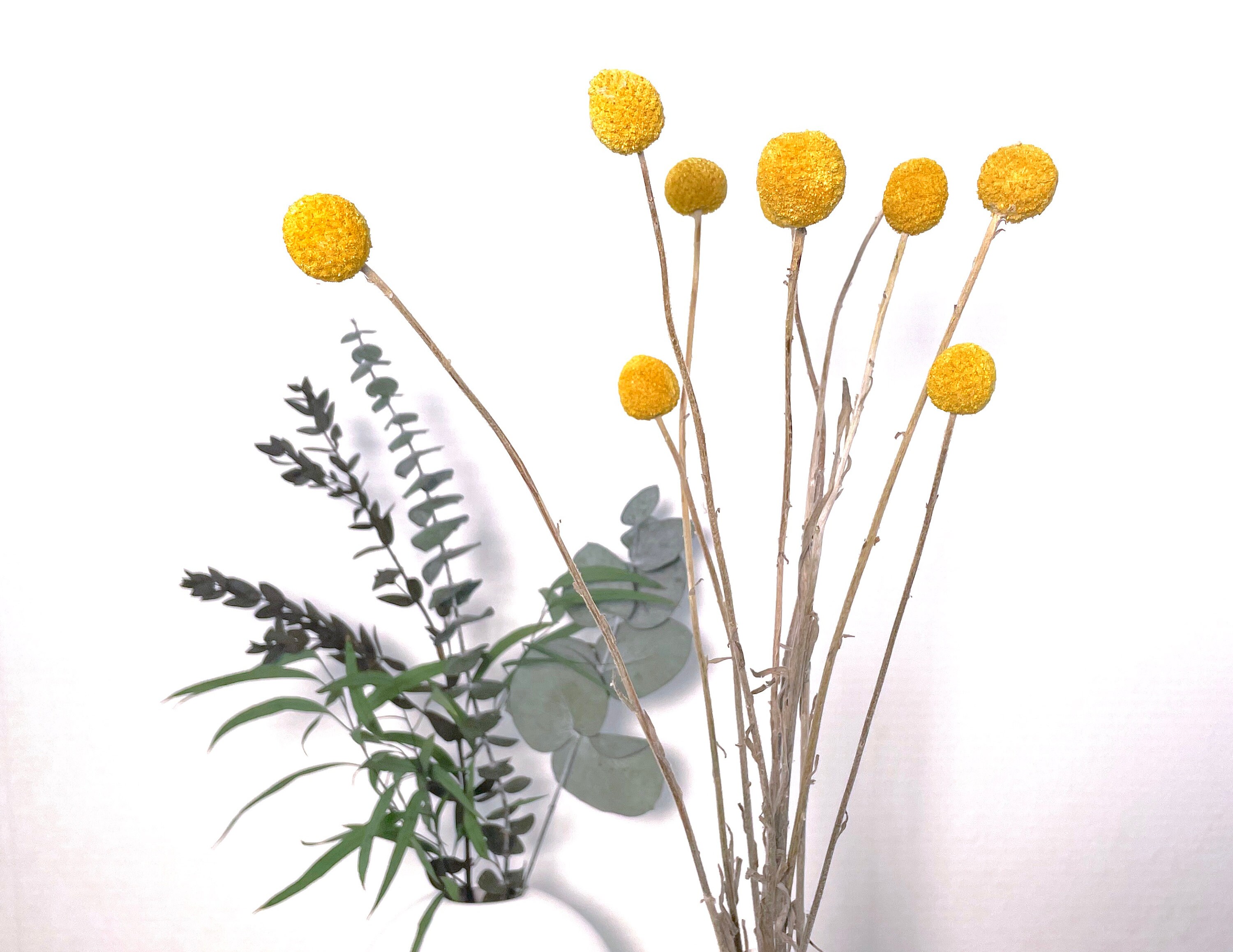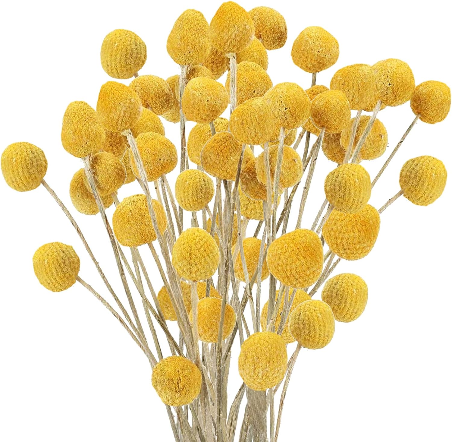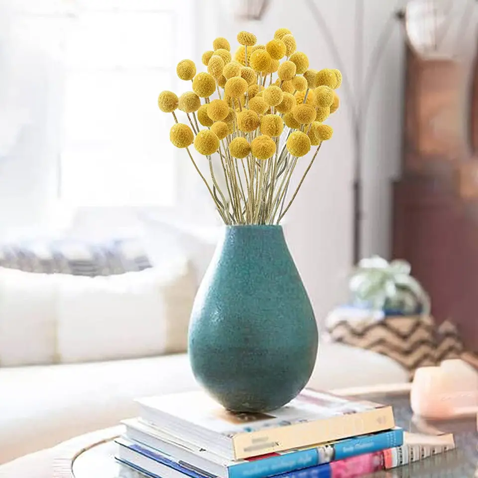 Diese natürlichen Craspedia Billy Balls sind der absolute Hingucker für deine Deko! Die 20 Stiele in Elfenbein-Weiß haben jeweils 43cm Länge und bringen natürlichen Charme in deine vier Wände. Perfekt für Vasen, Blumenarrangements oder Hochzeitsdekoration - die Möglichkeiten sind endlos! Da es sich um echte getrocknete Blumen handelt, brauchen sie kein Wasser und halten ewig. Einfach in die Vase stellen oder kreativ in Kränze und Gestecke einarbeiten. Super praktisch für alle, die keine Zeit für frische Blumen haben, aber trotzdem nicht auf natürliche Schönheit verzichten wollen. Die mit Kraftpapier umwickelten Drahtstiele lassen sich leicht biegen - so wird jedes Arrangement zum Kunstwerk!