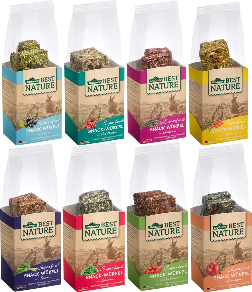 Deine kleinen Nager werden verrückt nach diesen Superfood-Würfeln sein! Die Dehner Best Nature Snacks sind komplett getreidefrei und vollgepackt mit leckeren Kräutern, Gemüse und Goji-Beeren. Perfekt für Zwergkaninchen, Meerschweinchen, Hamster und andere Nager. Ohne künstliche Farb- oder Konservierungsstoffe - nur das Beste für deine Fellnasen! Die würfelförmigen Snacks liefern wichtige B-Vitamine, Aminosäuren und Antioxidantien. Hergestellt in Deutschland aus hochwertigen Rohstoffen. Ein gesunder Leckerbissen der Abwechslung in den Speiseplan bringt und gleichzeitig das Immunsystem stärkt. Deine Tiere werden dich lieben!