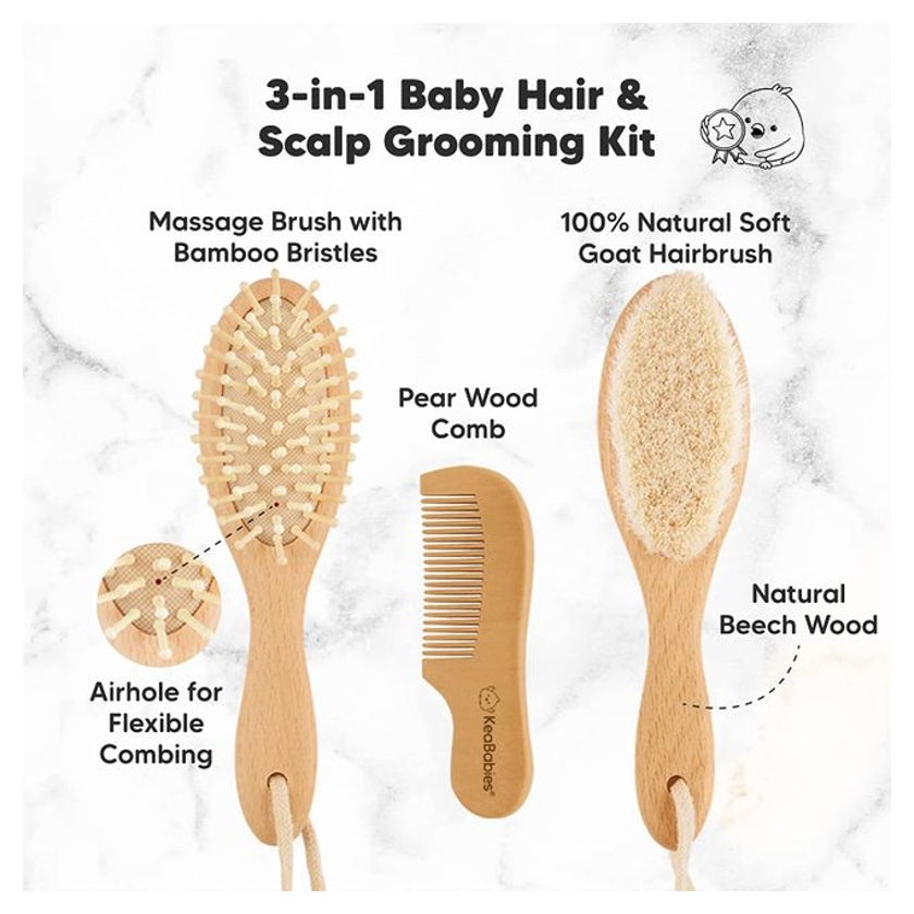 Perfekt für die zarte Kopfhaut deines Babys! Unser 2-in-1 Set aus natürlichem Holz besteht aus einer extra weichen Ziegenborsten-Bürste und einem praktischen Kamm. Die Bürste massiert sanft die Kopfhaut, beugt Milchschorf vor und reduziert Irritationen. Der Holzkamm entwirrt nicht nur, sondern regt auch die Durchblutung an - ideal für gesundes Haarwachstum. Das Set ist super schonend und für alle Haartypen geeignet, ob feines, dickes oder lockiges Haar. Material: Naturholz mit Ziegenborsten. Im Set: 1x Baby Haarbürste + 1x Baby Haarkamm. Einfach perfekt für die tägliche Pflegeroutine deines Kleinen!