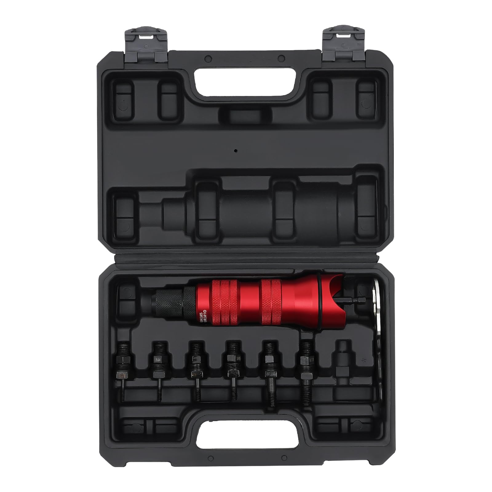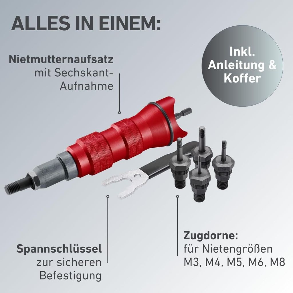Mit diesem praktischen Nietmuttern-Aufsatz setzt du Gewindenieten blitzschnell und kraftsparend! Das Set enthält vier Wechselköpfe für die gängigen Größen M3, M4, M5 und M6. Einfach auf deine Bohrmaschine oder Akkuschrauber mit 1/4\ Sechskant-Aufnahme stecken und schon kannst du professionelle Nietverbindungen mit Innengewinde herstellen. Arbeitet mit Edelstahl- und Aluminiumnieten gleichermaßen gut. Die robuste Konstruktion (139mm lang) hält auch bei häufigem Einsatz stand. Im Lieferumfang findest du neben den Köpfen auch einen Schlüssel zum einfachen Wechseln. Perfekt für Metallarbeiten, Fahrzeugbau, Möbelmontage oder Hobby-Projekte. Spart enorm Zeit und Kraft gegenüber manuellen Nietzangen - ein echter Game-Changer für jede Werkstatt!