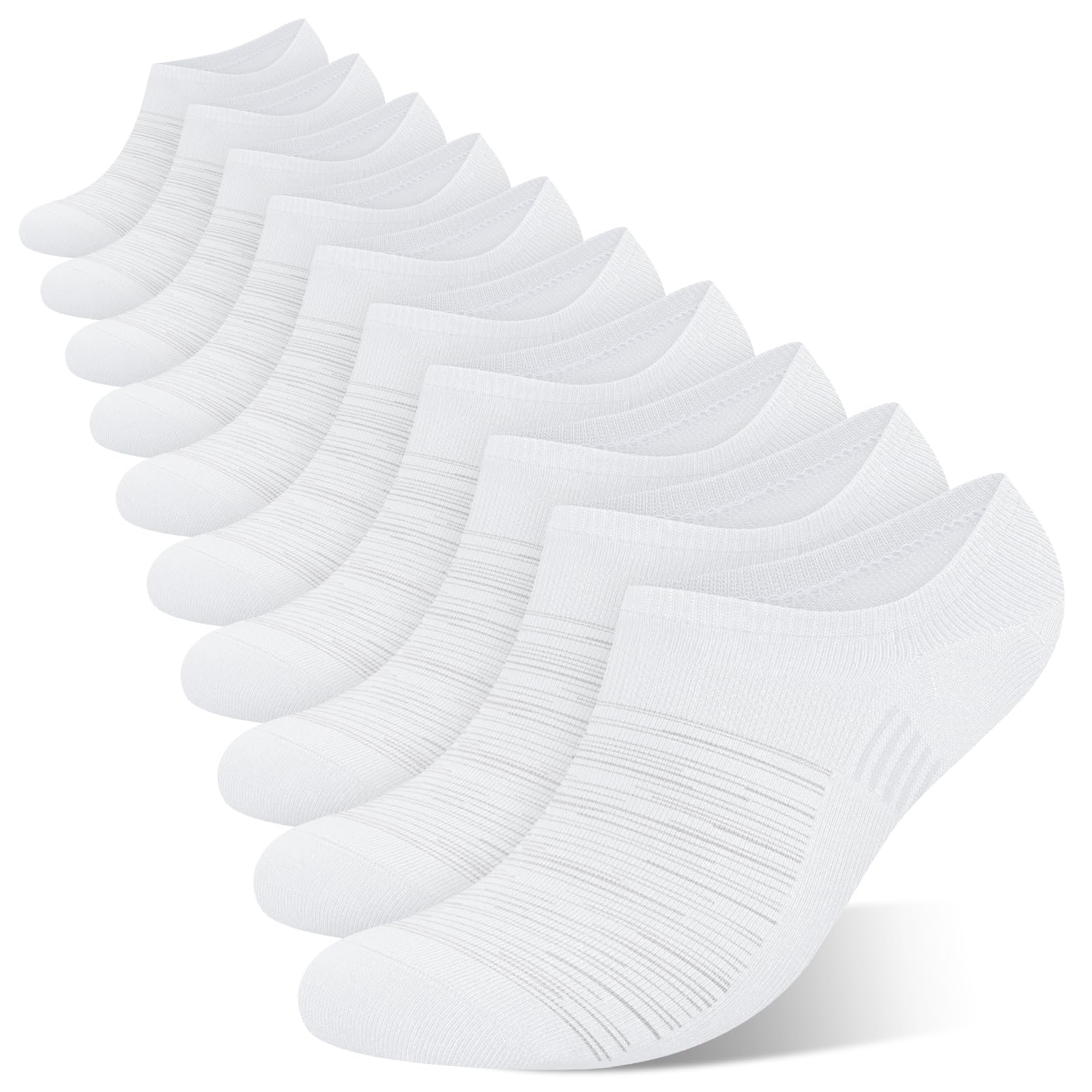Endlich unsichtbare Socken die nicht rutschen! Dieses 10er-Pack No-Show-Socken ist die Lösung für alle, die keine sichtbaren Socken in ihren Sneakern oder Lederschuhen tragen wollen. Mit 3 rutschfesten Silikon-Grips an der Ferse bleiben die Socken den ganzen Tag sicher an Ort und Stelle - kein lästiges Verrutschen mehr! Das Y-förmige Fersendesign umschließt deine Ferse perfekt. Verstärkte Zehen und Fersen sorgen für extra Langlebigkeit, sodass keine Löcher entstehen. Aus weichem, atmungsaktivem Material gefertigt, halten sie deine Füße den ganzen Tag trocken. Die elastischen Bündchen garantieren perfekten Sitz. Passt für US-Herrenschuhgrößen 6-13 (bei Zwischengrößen lieber eine Nummer größer bestellen). Einfach in der Maschine waschbar - praktisch für den Alltag. Nie wieder nervige sichtbare Sockenränder! Hol dir das Set und du hast für Wochen ausgesorgt.