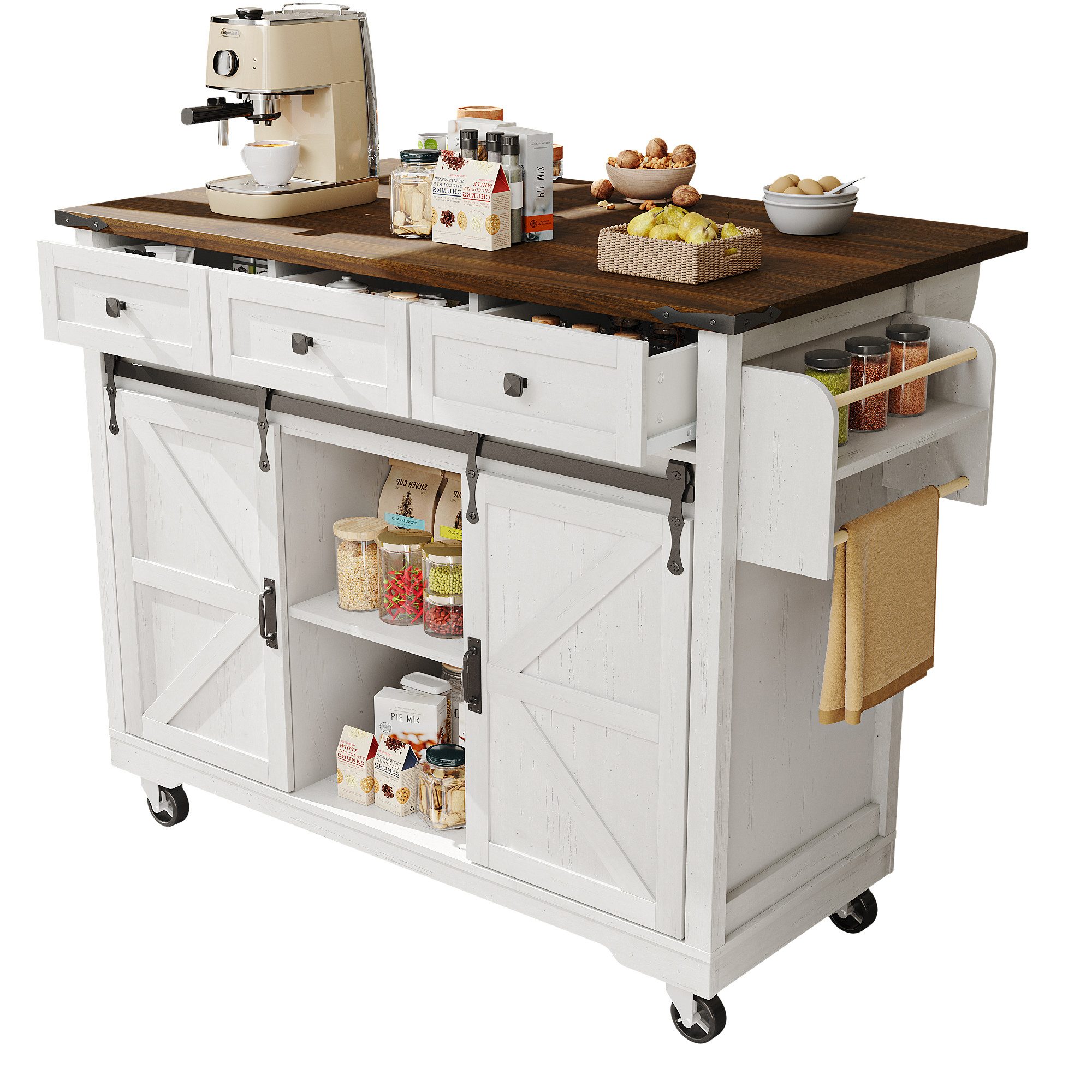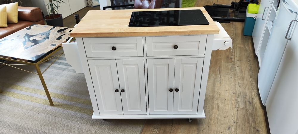 Mehr Platz und Ordnung in deiner Küche! Diese praktische Kücheninsel von NovaFurnish in Grau ist der absolute Allrounder für moderne Haushalte. Mit 112x44,6-74,6x94,2cm bietet sie nicht nur jede Menge Stauraum, sondern auch eine ausziehbare Arbeitsplatte die sich bei Bedarf vergrößern lässt. Die Arbeitsplatte trägt stolze 50kg - perfekt zum Kochen und Backen. Integriertes Mülleimer-Fach, Schubladen und Ablageflächen sorgen für perfekte Organisation. Die fünf Rollen (zwei mit Feststeller) machen die Insel mobil - schieb sie einfach dorthin, wo du sie brauchst! Aus robustem MDF gefertigt und mit sanft schließenden Schubladen. Einfach montieren mit der bebilderten Anleitung - alles Nötige ist im Lieferumfang enthalten. Perfekt für kleine Küchen, wo jeder Zentimeter zählt. Ob als zusätzliche Arbeitsfläche, Frühstückstheke oder Ablage - diese Insel macht deine Küche sofort funktionaler und stylischer. Hol dir den Küchenhelfer, der wirklich alles kann!