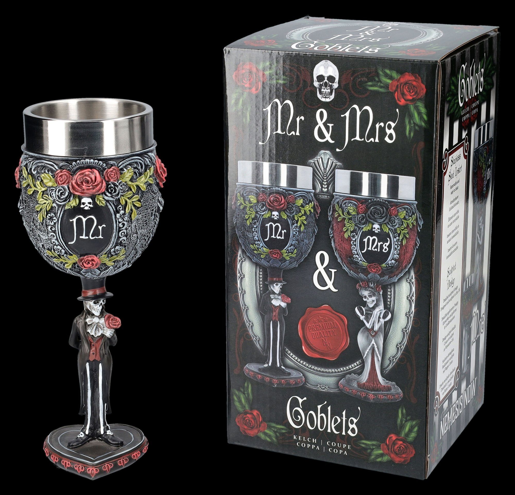 Dark Fantasy at its best! Dieser Skelett-Rosenkelch von Nemesis Now ist einfach der Hammer. Mit 20cm Höhe ist er ein echter Blickfang und zeigt eine detailreiche rote Rose, die von einer geheimnisvollen Skeletthand gehalten wird. Aus hochwertigem Kunstharz gefertigt und liebevoll handbemalt, ist jedes Stück ein Unikat. Der praktische Edelstahl-Einsatz macht ihn perfekt für kalte Getränke - ob mit oder ohne, er sieht einfach fantastisch aus. Die Basis mit den kleinen Totenköpfen rundet das düstere Design perfekt ab. Perfekt für Gothic-Fans, Sammler oder alle, die etwas Besonderes suchen. Einfach hinstellen und staunen - dieser Kelch ist mehr als nur ein Trinkgefäß, er ist ein Statement!