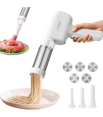 Frische Pasta in Sekunden - mit diesem elektrischen Idiyappam Maker! Der kabellose Nudelautomat hat 40W Power und einen 1500mAh Akku für bis zu 45 Portionen pro Ladung. Einfach Teig einfüllen, Aufsatz wählen und in 20 Sekunden hast du perfekte Nudeln. Inklusive 5 verschiedenen Edelstahl-Formen für verschiedene Nudelsorten. Per USB-C schnell aufladbar - super praktisch für Küche, Camping oder Reisen. Aus 304 Edelstahl gefertigt und leicht zu reinigen. Fassungsvermögen 200g Teig - ideal für 1-2 Personen. Tipp: Teig vorher 120 Minuten ruhen lassen für beste Ergebnisse. Direkt in kochendes Wasser pressen verhindert das Zusammenkleben. Kompakt und leicht - der perfekte Begleiter für frische Pasta-Liebhaber!