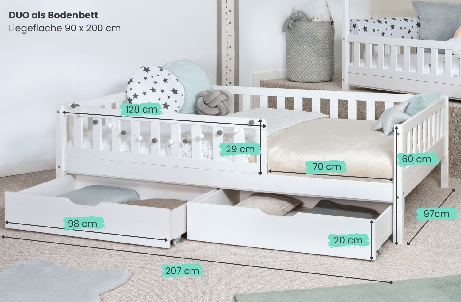 Wie süß ist denn dieses Hausbett?! Das Lilo Nuo Kinderbett in 100x200cm verwandelt jedes Kinderzimmer in ein gemütliches Reich. Mit komplettem Rausfallschutz (22cm hoch) rundherum ist dein Kind sicher aufgehoben - die Gitter lassen sich aber auch abbauen, wenn's größer wird. Aus massivem Kiefernholz gefertigt und super stabil (trägt bis zu 180kg!). Der praktische Bettkasten bietet riesigen Stauraum für Spielzeug, Bettwäsche oder Kleidung. Die Montage ist kinderleicht mit beiliegendem Torx-Schlüssel. Das Hausdach ist je nach Größe zwischen 122-167cm hoch - ein echter Hingucker! Perfekt für Mädchen und Jungen, die ihr eigenes kleines Reich lieben. Ob mit Vorhang, Lichterkette oder einfach so - dieses Bett wird zum Lieblingsplatz deines Kindes. Träume werden hier noch schöner!