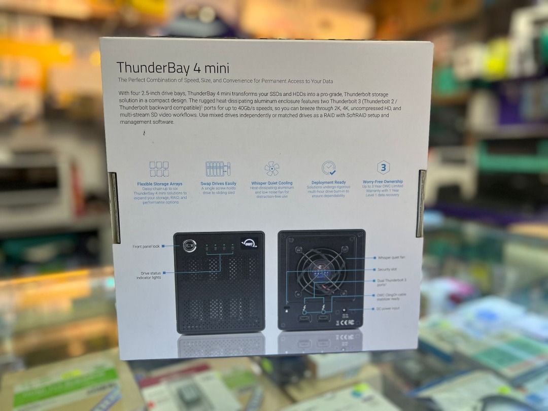 Kompaktes Powerhouse für deine Festplatten! Das OWC ThunderBay 4 mini nimmt bis zu vier 2,5\ HDDs oder SSDs auf - im Hot-Swap Betrieb, also Wechsel im laufenden Betrieb! Mit Thunderbolt 3 Anschlüssen erreicht es bis zu 1556 MB/s. Daisy-Chaining für bis zu fünf weitere Thunderbolt Geräte. Kompatibel mit Mac und Windows. Perfekt für Video-Editoren, Fotografen oder alle, die viel Speicherplatz brauchen. In schickem Schwarz. Einfach anschließen und sofort produktiver arbeiten!