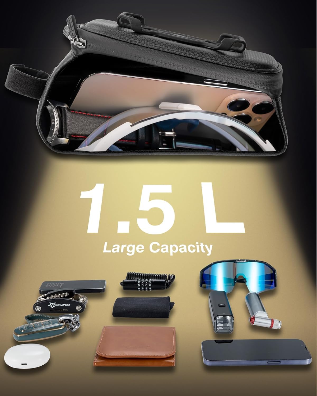 Praktische Oberrohr-Tasche für dein Fahrrad! Mit 1 Liter Volumen und 20x9x11cm Maßen bietet sie genug Stauraum für Handy, Snacks, Schlüssel und kleine Werkteile. Integrierte Touchscreen-Halterung ermöglicht die Navigation während der Fahrt ohne das Handy herausnehmen zu müssen. Aus robustem 600D Polyester und Mesh-Material gefertigt das witterungsbeständig ist. Doppelter Reißverschluss für sicheren Verschluss und einfachen Zugriff. Stromlinienförmiges Design minimiert den Windwiderstand und beeinträchtigt nicht die Pedalbewegung. Verstellbare Gurte für sicheren Sitz am Oberrohr, Vorbau oder Lenker. Ideal für Pendler, Bikepacking, Radtouren oder Stadtfahrten. Passt für Handys bis 7 Zoll Bildschirmgröße. Einfach zu montieren und abnehmbar für flexiblen Einsatz. Verbessert dein Fahrerlebnis mit praktischem Stauraum und Navigation direkt vor Augen. Einfach anbringen und von der Bequemlichkeit überzeugt sein!