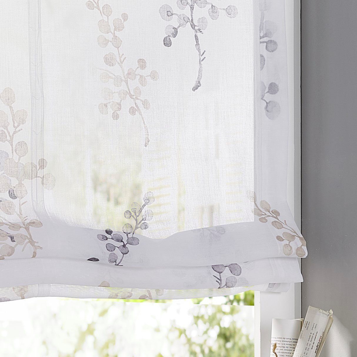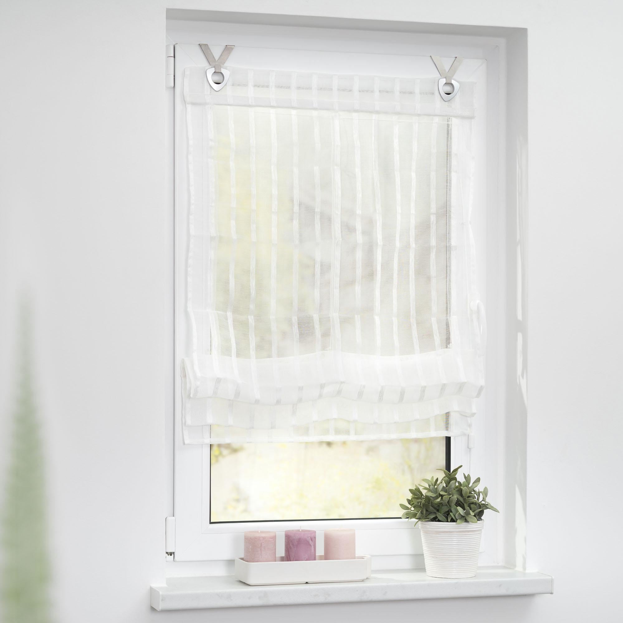 Hey, dieses Yujiao Mao Raffrollo ist perfekt für alle die nicht bohren wollen! Mit modernem Streifen-Design in braun, 120x130cm groß. Aus 100% Polyester-Voile - luftig und transparent.\\n\\nEinfach mit Haken am Fensterflügel befestigen (13-19mm). Mit Zugschnüren in jeder Höhe einstellbar. Seitlich gesäumt und mit Beschwerungsstabe.\\n\\nSuper für Wohnzimmer, Küche oder Balkon. Macht sofort gemütliche Atmosphäre und ist maschinenwaschbar. Einfach aufhängen und genießen!