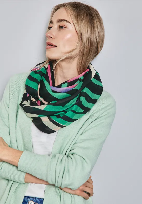 Schicker Loop-Schal von Street One! Mit modernem grafischen Muster und aus 100% Modal gefertigt, ist er superweich und angenehm zu tragen. Einfach überziehen und er sitzt perfekt - kein lästiges Binden oder Verknoten. Ob zum Mantel, zur Jacke oder einfach so: Dieser Schal ist ein vielseitiges Accessoire für jeden Anlass. Aus Indien importiert, überzeugt er durch Qualität und Tragekomfort. Einfach stylisch!