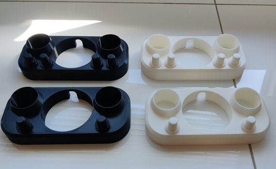Der Halter bietet Platz für 2 Zahnbürsten-Ladestationen, hat ein Fach für Handzahnbürsten oder Zahnpasta und sogar spezielle Löcher für die Bürstenköpfe. So bleibt alles sauber und übersichtlich.
