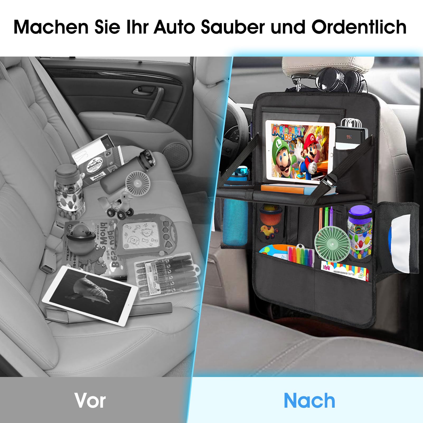Dieser Auto-Organizer hat endlich Ordnung in unser Familienauto gebracht! Aus robustem PU-Material und wasserdicht - perfekt wenn mal was ausläuft. Mit 59,5x42cm passt er perfekt auf die Rücksitz-Lehne.\\n\\nDie vielen Fächer sind super praktisch: Tablet-Halter für die Kinder, Taschentuch-Spender, Platz für Wasserflaschen, Sonnenbrillen, sogar der Regenschirm hat jetzt sein eigenes Fach. Die verstellbaren Schnallen halten bombenfest - nichts wackelt während der Fahrt.\\n\\nDer Aufbau war in 5 Minuten erledigt - einfach um die Kopfstützen schnallen und fertig. Passt in Limousinen und SUVs. Seit wir den Organizer haben, sind keine Spielzeuge und Snacks mehr auf dem Boden verstreut. Absolute Lebensretter für Familien mit Kindern!