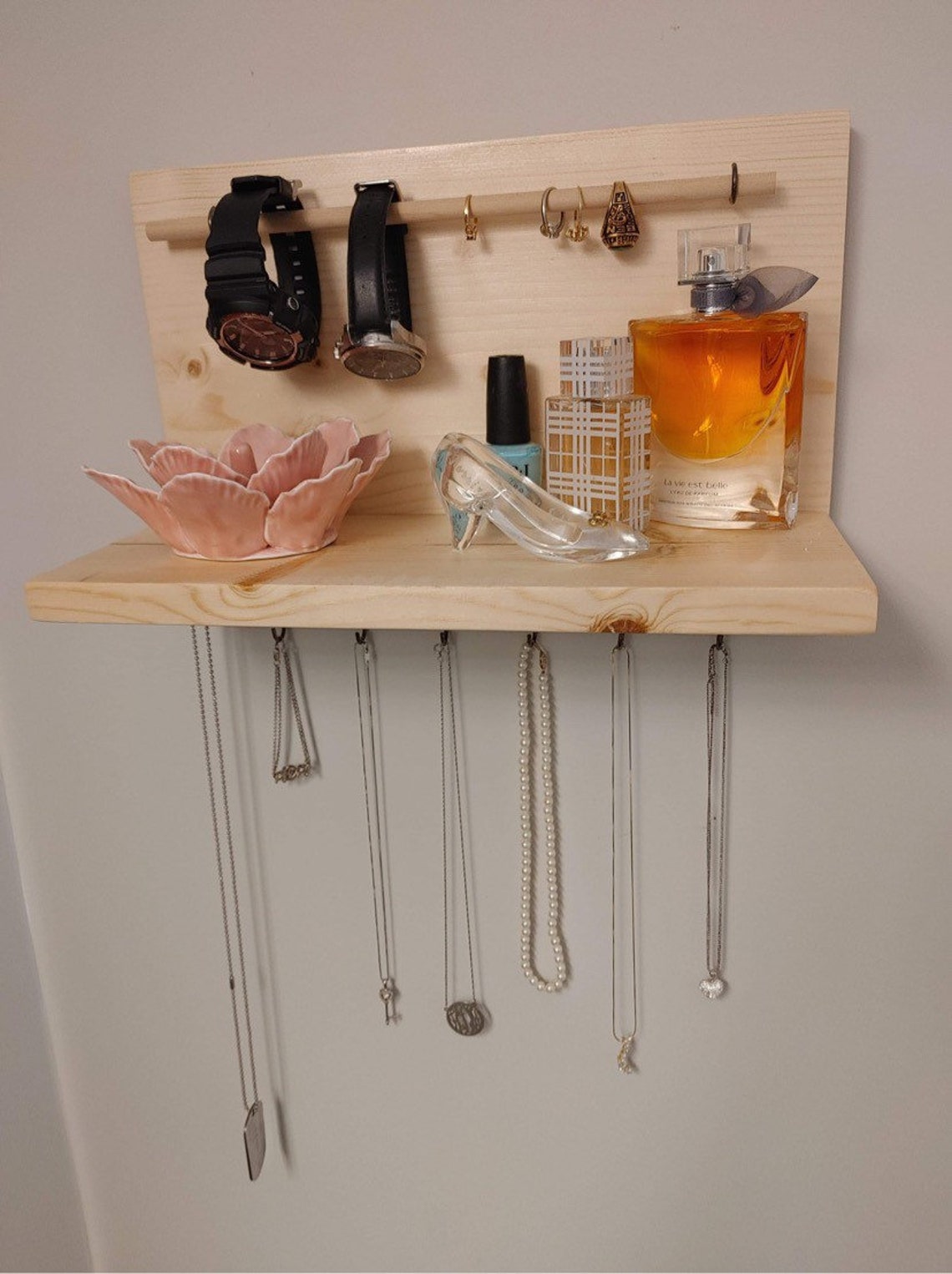 Schluss mit verknoteten Halsketten und verlorenen Ohrringen! Der Emfogoo Schmuck Organizer bringt Ordnung in deine Schmuckkollektion! Mit 5 cleveren Funktionen in einem: Obere Holzablage für Parfüms und Kosmetik, Samtringhalter für bis zu 35 Ringe, drehbare Stecktafel für Ohrstecker, 7 Haken für Armbänder und 13 doppelstöckige Kleiderbügel für Halsketten! Aus massivem Holz mit stylischem weißem Finish - sieht nicht nur gut aus, sondern ist auch super stabil! Die antiken Metallhaken und Samtpolsterungen schützen deinen wertvollen Schmuck vor Kratzern! Einfache Wandmontage mit beiliegender Hardware - in wenigen Minuten installiert! Perfekt fürs Schlafzimmer, den Kleiderschrank oder den Schminktisch! Spart unglaublich viel Platz und alles ist immer griffbereit! Kein langes Suchen mehr - du siehst sofort, was du suchst! Ein tolles Geschenk für jede Frau - ob Mama, Freundin oder Tochter! Mach dein Leben einfacher und stylischer mit diesem praktischen Organizer!