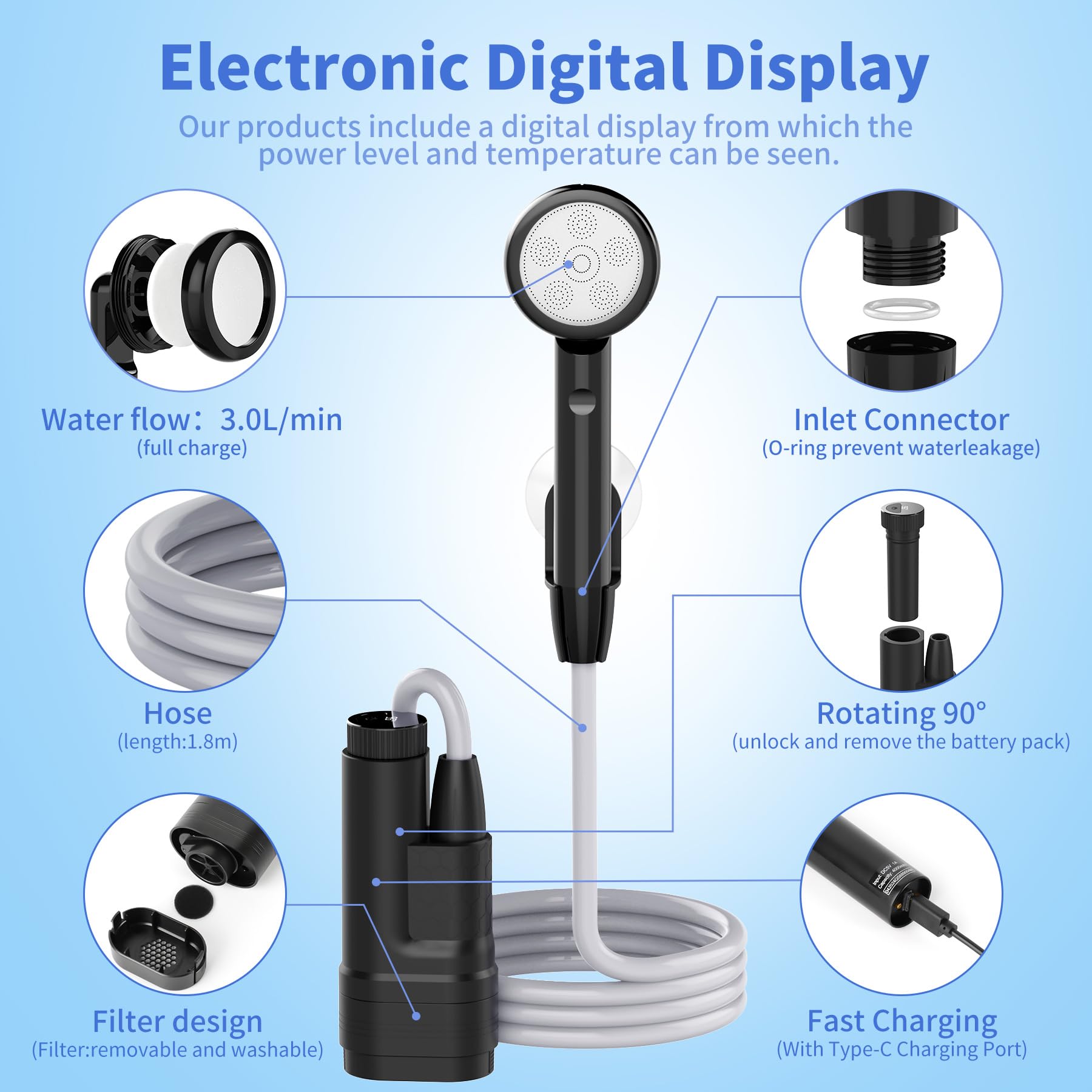 Perfekt für Outdoor-Fans diese Aodejoy Campingdusche! Kompakt und wasserdicht passt sie in jeden Rucksack. Die Pumpe mit zwei Geschwindigkeiten ist ideal für sanftes Duschen oder kräftiges Reinigen. Der verstärkte PVC-Schlauch mit Edelstahlanschluss ist knickfest und erreicht auch schwer zugängliche Stellen. Mit 5-3 l/min Leistung und verschiedenen Sprühmodi (Impuls, Regen, Mix) vielseitig einsetzbar: Camping, Gartenbewässerung, Autowäsche, Haustierbad oder einfach mal outdoor duschen. Ein Allrounder für unterwegs - ob beim Camping, im Garten oder auf Reisen!