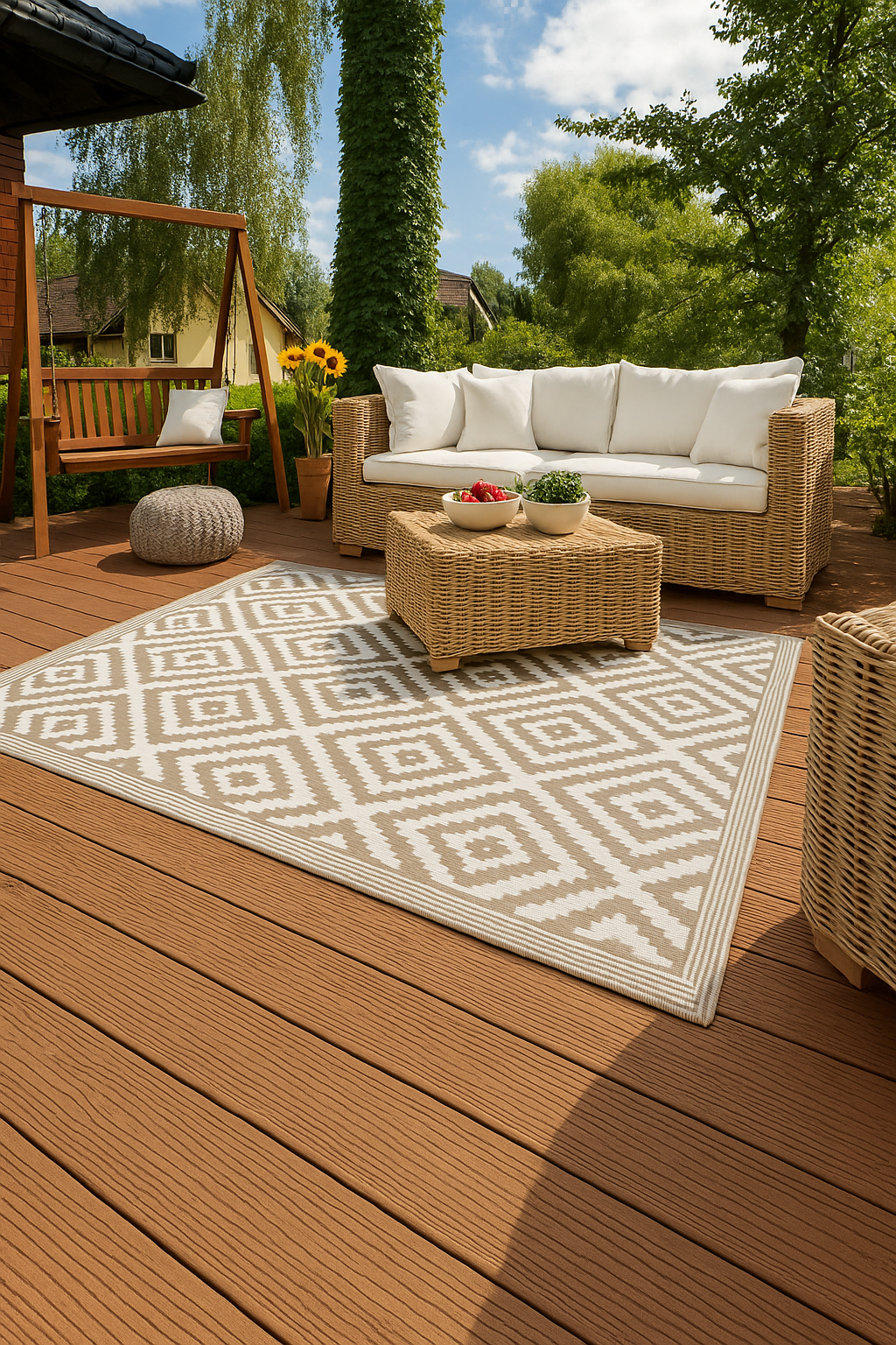 Stylisher Teppich für drinnen und draußen! Der Eldorado in Desert Bloom Design mit geometrischem Muster in warmen Wüstentönen. 80x150cm, nur 4mm Florhöhe aus 100% Polypropylen. UV-beständig - Farben bleichen nicht aus. Oeko-Tex zertifiziert und schadstoffgeprüft. Pflegeleicht, antistatisch, für Fußbodenheizung geeignet. Perfekt für Wohnzimmer, Balkon, Terrasse oder Garten. Macht überall eine gute Figur!