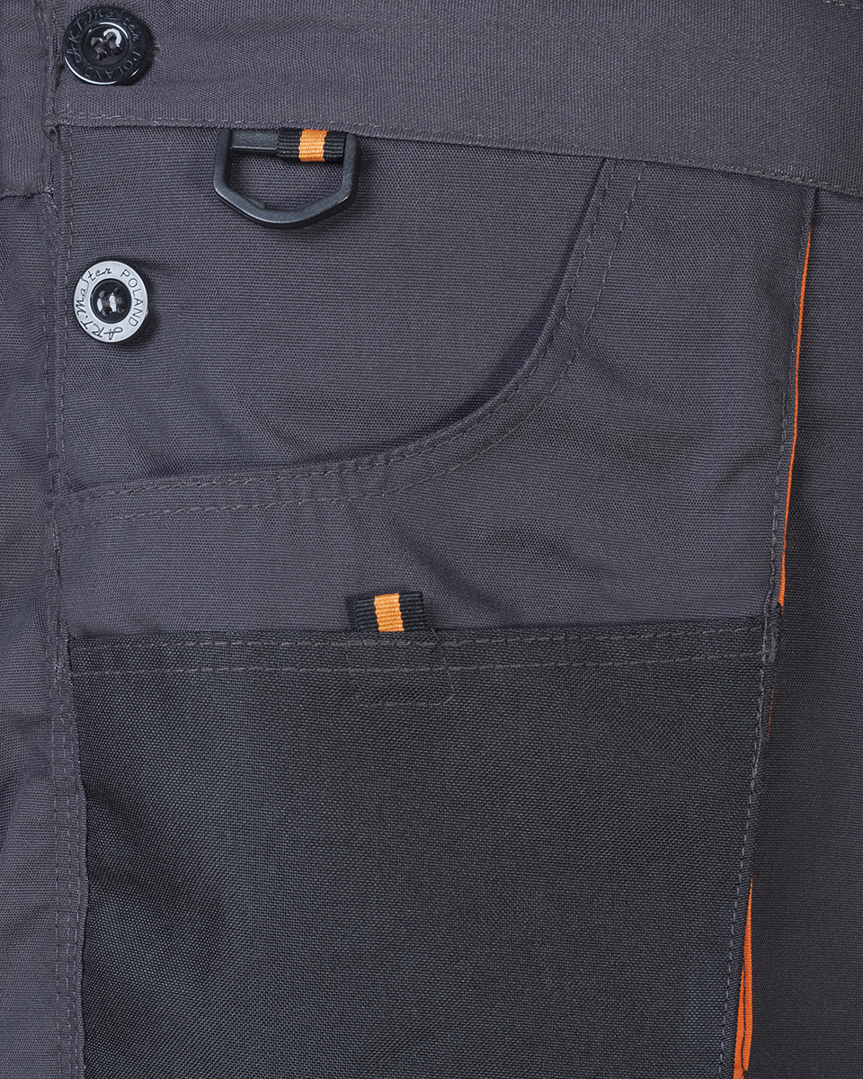 Robuste Arbeitshose für anspruchsvolle Jobs! Die ART.MAS PAS Classic in dunkelgrau mit auffälligen orangen Einsätzen. Stoff: 65% Polyester/35% Baumwolle, 270g/m² - extrem strapazierfähig. Mit Knietaschen für Knieschützer - ideal für handwerkliche Arbeiten. Praktische Taschen: zwei Gesäßtaschen mit Klett, Seitentaschen, Handytasche. Schlaufe für Schlüssel - alles griffbereit. Feste Nähte - hält auch bei schwerer Belastung. Bequeme Passform - volle Bewegungsfreiheit. Perfekt für Handwerker, Bauarbeiter und alle, die robuste Kleidung brauchen. Vor Bestellung Größentabelle prüfen - für perfekten Sitz!
