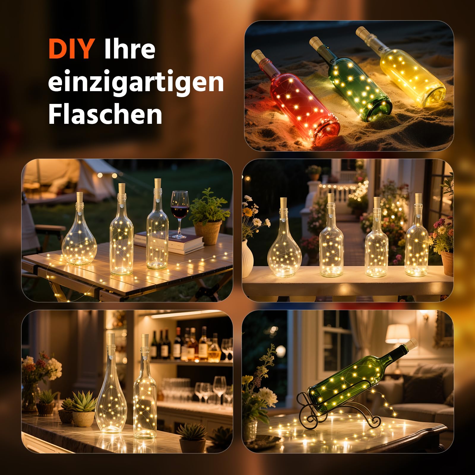 Hey Deko-Fans! Diese PChero Flaschenlichter bringen magische Stimmung in euer Zuhause! Im 10er-Set mit praktischer Fernbedienung - steuert alle Lichter gleichzeitig! Nur 2 Stunden laden = bis zu 55 Stunden Lichtgenuss! Kein ständiges Nachladen nötig. 4 Timer-Modi (2/4/6/8 Stunden) - automatisches Abschalten inklusive! Dimmbare Helligkeit von 20% bis 100% für die perfekte Stimmung. 4 verschiedene Licht-Modi für jedes Ambiente! Die universellen Korken (1,2-2,2 cm) passen auf Wein-, Sekt-, Öl- und Saftflaschen. Perfekt für Hochzeiten, Weihnachtsmärkte, Bars, Restaurants oder Gartenpartys! Kreatives DIY-Set - arrangiert die flexiblen Lichterketten in Gläsern, um Spiegel oder als Tischläufer! Umweltfreundlicher als batteriebetriebene Alternativen - spart Stromkosten! Einfach in die Flasche stecken, Korken leicht andrehen und den Zauber genießen! Für alle, die ihre Räume in ein gemütliches Lichtermeer verwandeln wollen - absolut bezaubernd!