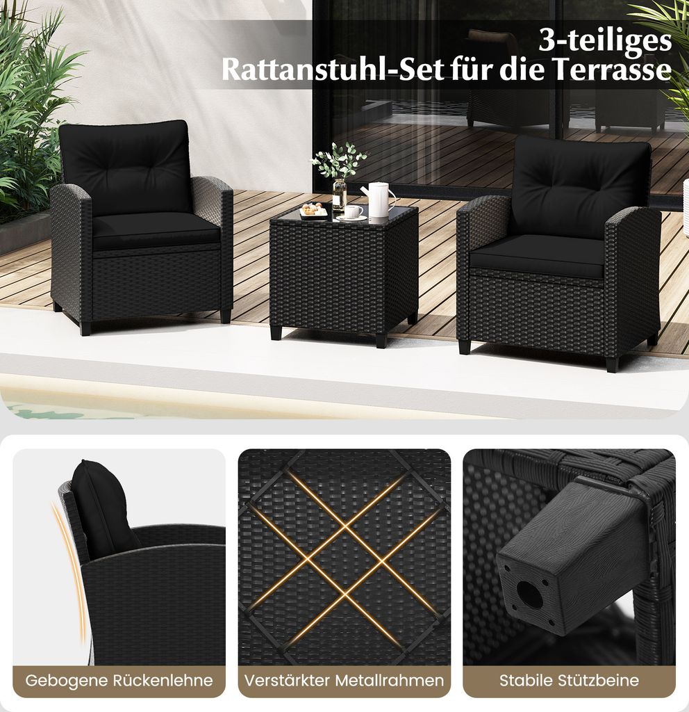 Entspannung pur im eigenen Garten! Dieses 3-teilige COSTWAY Gartenmöbel-Set verwandelt deine Terrasse in eine Wohlfühloase. Aus stabilem, handgeflochtenem PE-Rattan in grau, sonnen- und farbbeständig. Inklusive Beistelltisch mit gehärteter Glasplatte und zwei bequemen Stühlen mit marineblauen Kissen. Jeder Stuhl trägt bis zu 180kg und hat eine großzügige Sitzfläche (61x61cm). Die Kissen sind atmungsaktiv, hautfreundlich und die Bezüge abnehmbar und waschbar. Verstellbare Fußpolister sorgen für Stabilität auf unebenem Untergrund. Perfekt für Garten, Balkon, Terrasse oder Veranda. Einfach montieren und schon kannst du die Sonne genießen. Tipp: Vor Regen schützen für längere Haltbarkeit. Mach deinen Außenbereich zur perfekten Entspannungszone!