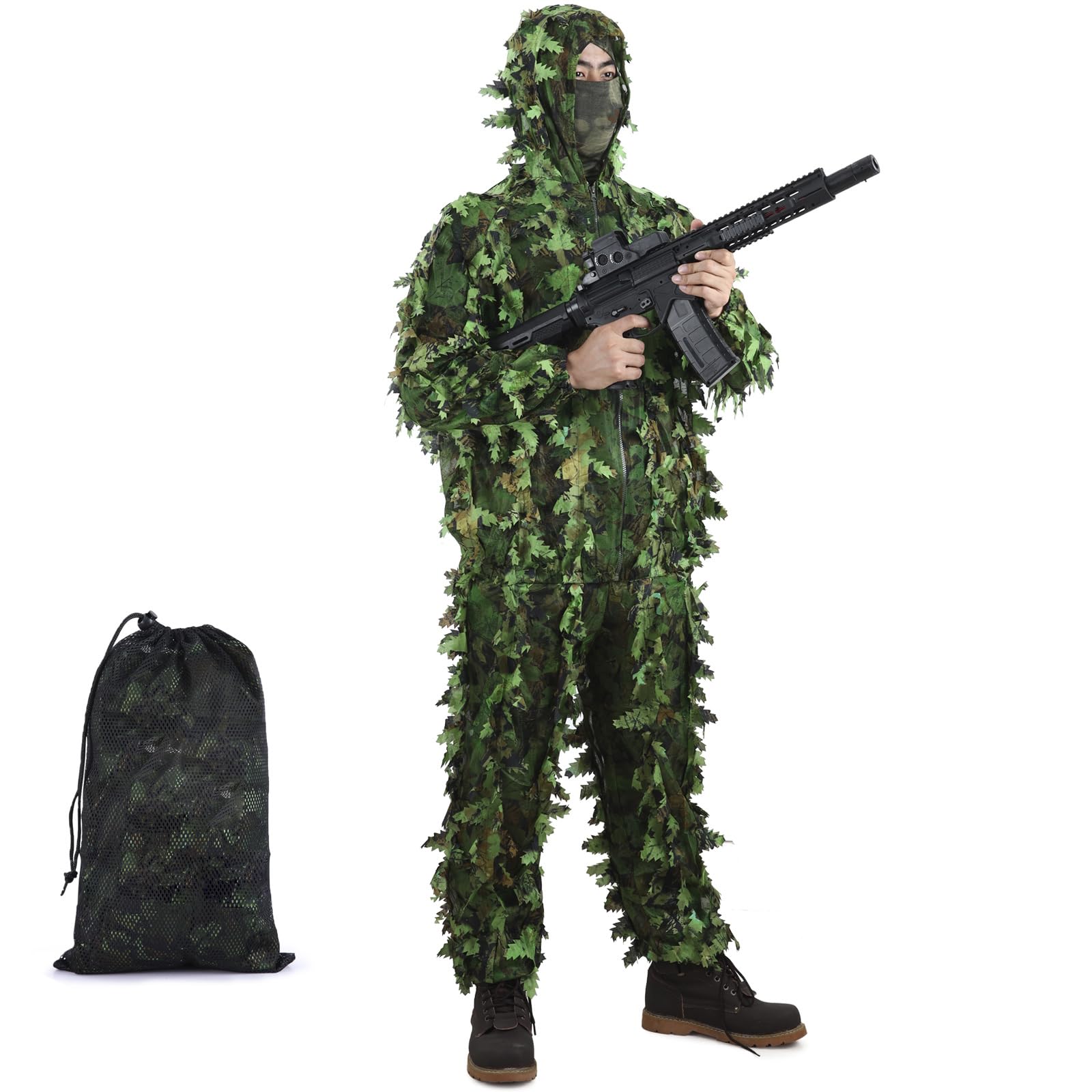 Willst du unsichtbar werden? Mit diesem PELLOR 3D Ghillie Tarnanzug verschmilzt du komplett mit der Natur! Der Anzug in Woodland-Tarnung ist aus super atmungsaktivem Polyester und hat diese coolen 3D-Streifen, die wie echte Blätter und Zweige aussehen. Perfekt für Jäger, Paintball-Spieler oder Outdoor-Fans, die wirklich unerkannt bleiben wollen. Die Kapuze gibt's obendrauf - damit ist auch dein Kopf bestens getarnt! Praktische Features: Knopfverschluss vorne, elastischer Bund an der Hose und Kordelzug für perfekte Passform. Größe passt für 170-190cm große Personen bis 90kg. Im Set enthalten: Jacke mit Kapuze, Hose und praktische Aufbewahrungstasche. Egal ob im Wald, auf dem Feld oder beim Geländespiel - mit diesem Anzug wirst du zur echten Tarnkappe! Einfach anziehen und staunen, wie gut du in der Natur verschwindest. Für Männer und Frauen gleichermaßen geeignet - Unisex at its best!