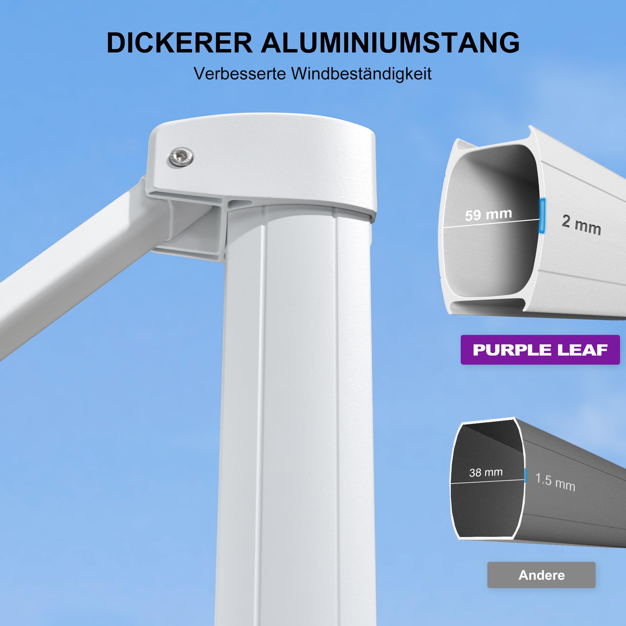 Endlich perfekten Schatten im Garten! Dieser PURPLE LEAF Ampelschirm in 360x270 cm ist ein echter Sonnenschutz-Profi. Mit der 360-Grad-Drehung kannst du ihn immer genau zur Sonne ausrichten - einfach Fußpedal drücken und drehen. Die Kurbel macht das Öffnen und Schließen super easy, und du hast 5 verschiedene Neigungswinkel zur Auswahl. Das weiße Aluminium-Gestell mit 8 stabilen Rippen steht bombenfest, und der Stoff aus 240 g/m² Polyester ist UV-beständig und wasserabweisend. Achtung: Ständer nicht im Lieferumfang enthalten! Den passenden findest du separat. Perfekt für Terrasse, Garten oder Balkon - damit wird jeder Sommertag entspannt!