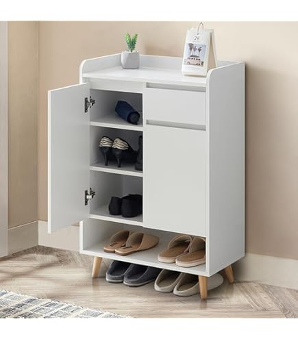Schluss mit Schuhchaos im Flur! Dieser Schuhschrank von HOMCOM bringt Ordnung in deine Diele. Mit Platz für bis zu 12 Paar Schuhe bis Größe 46 - das reicht für die ganze Familie! Die zwei Klappschubladen sind super praktisch: Einfach aufklappen, Schuhe rein, zuklappen - fertig! Die Regale sind verstellbar, also passen auch Stiefel oder High Heels problemlos rein. Oben drauf ist eine Ablagefläche, perfekt für Schlüssel, Briefe oder Deko. Mit nur 60x24x80 cm ist der Schrank schmal und passt auch in kleine Flure oder Wohnungen. Die weiße Farbe mit der hellen Eichenoptik sieht modern und clean aus. Und mit der Kippsicherung steht er sicher und fest. Aus starker Spanplatte mit Melamin-Oberfläche - leicht zu reinigen und hält was aus. Maximal 22 kg Gesamtgewicht, also nicht überladen! Montage nötig, aber geht easy. Endlich Ordnung im Eingangsbereich!
