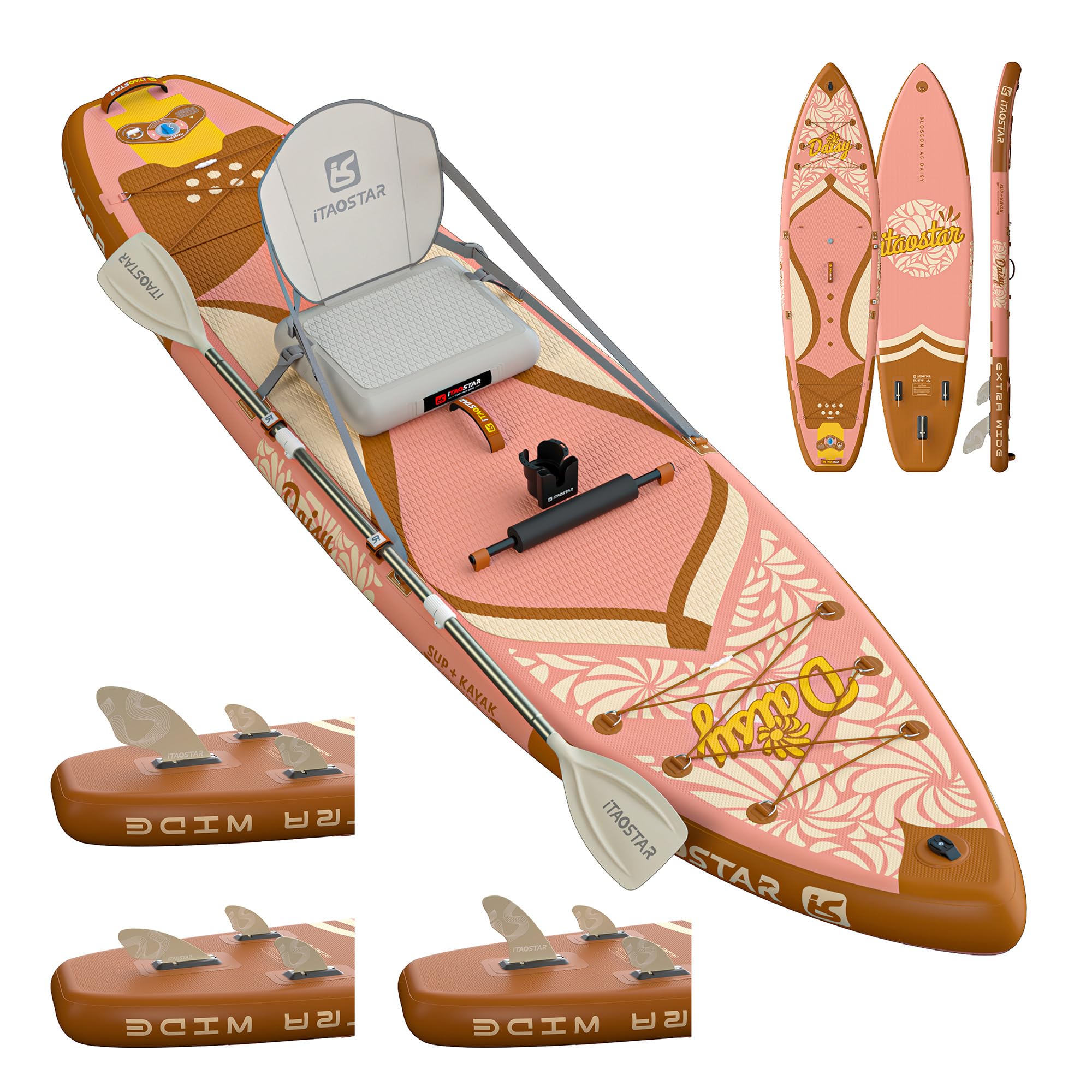 Ab aufs Wasser mit diesem super-stabilen Paddleboard! Mit 89 cm Breite und einer Tragkraft von bis zu 450 lbs (ca. 204 kg) ist das iTAOSTAR Pets Board perfekt für Solo-Paddler, Familien und sogar deinen vierbeinigen Freund. Das Besondere: Die fünf maßgeschneiderten Flossen sorgen für maximale Balance und Manövrierfähigkeit. Noch nicht genug? Mit dem beiliegenden Kajak-Set (Sitz und Fußstütze) verwandelst du das SUP im Handumdrehen in ein gemütliches Kajak! Im Komplettset ist wirklich alles dabei: verstellbares Paddel, Doppelpumpe (Aufpumpen in 5-10 Min.), 120-Liter-Rucksack, wasserdichte Tasche, Trockenbeutel, Flagge, Fußfessel und sogar ein Becherhalter für dein Getränk. Die 4. Generation Paddel mit Dual-Rib-Blättern gibt dir Power für jeden Schlag. Perfekt für Seen, Flüsse und das Meer - ob Anfänger oder Profi, hier kommt garantiert keine Langeweile auf! Einfach aufpumpen, ins Wasser und den Tag genießen!
