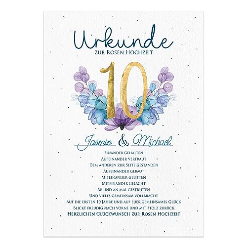 Das erste Jahr geschafft - das muss gefeiert werden! Diese wunderschöne Urkunde zur Papierhochzeit ist das perfekte Geschenk für das 1. Ehejubiläum. Im modernen Design, aber mit traditionellem Charme wird sie zu einer bleibenden Erinnerung. Gedruckt auf hochwertigem 300g/m² Strukturkarton im DIN A4 Format fühlt sie sich nicht nur gut an, sondern sieht auch edel aus. Das besondere Highlight: Die handveredelte Goldfolie in Form einer 1 verleiht dem Ganzen einen luxuriösen Touch. Die liebevollen Sprüche gehen direkt ins Herz und bleiben in Erinnerung. Hergestellt in Deutschland von einem Familienbetrieb mit viel Herzblut. Perfekt für den Bilderrahmen oder als Tischdekoration bei der Jubiläumsfeier. Viel mehr als nur eine Karte - ein zeitloses Andenken, das die Liebe des ersten gemeinsamen Jahres festhält. Ein Geschenk, das man nicht so schnell wegpackt, sondern gerne an die Wand hängt!