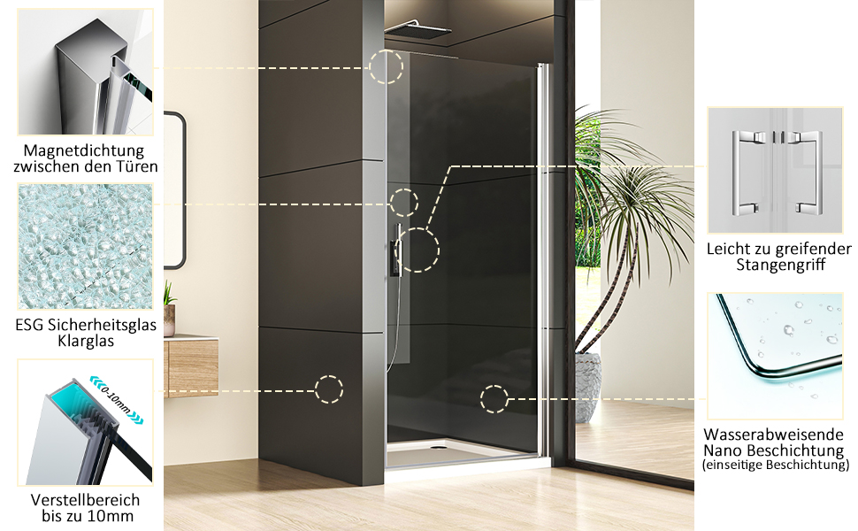 Platzsparend und stylisch – die IMPTS Pendeltür für deine Dusch-Nische! Mit 70 cm Breite (einstellbar 69–71 cm) und 195 cm Höhe passt sie auch in kleinere Bäder. Das 6 mm dicke ESG-Sicherheitsglas ist kratzfest und mit einer Nano-Beschichtung versehen, die Kalk- und Wasserflecken reduziert. Der Hebe-Senk-Mechanismus sorgt dafür, dass die Tür sanft schließt und nicht über den Boden schleift. Montiert werden kann sie links oder rechts, auch ebenerdig. Lieferung inkl. Griffe und Montagematerial – alles da für den einfachen Selbstbau. Ohne Duschwanne, also ideal wenn du schon eine hast oder eine individuell einbauen willst. Mach dein Bad zum Wohlfühl-Ort!