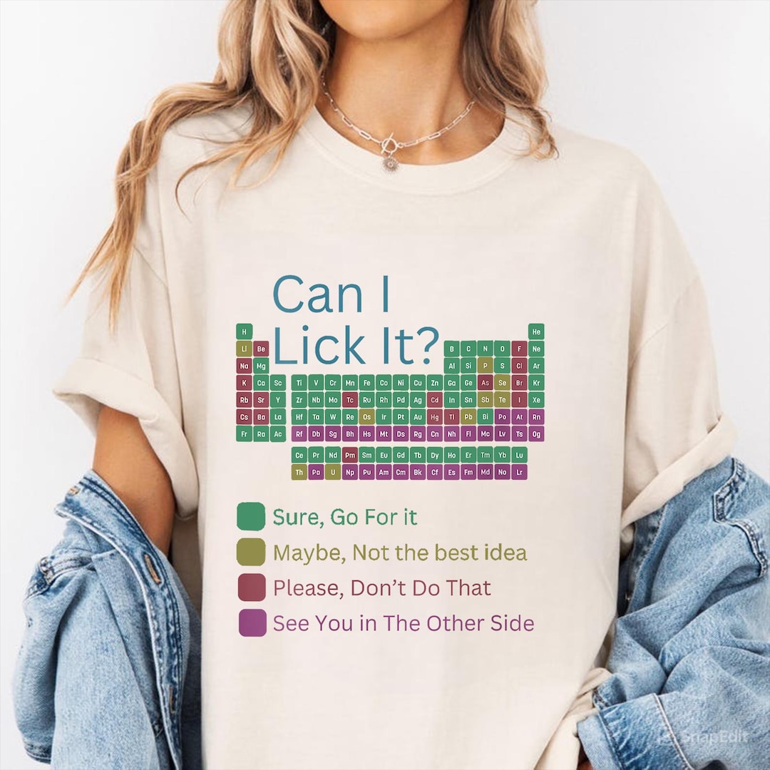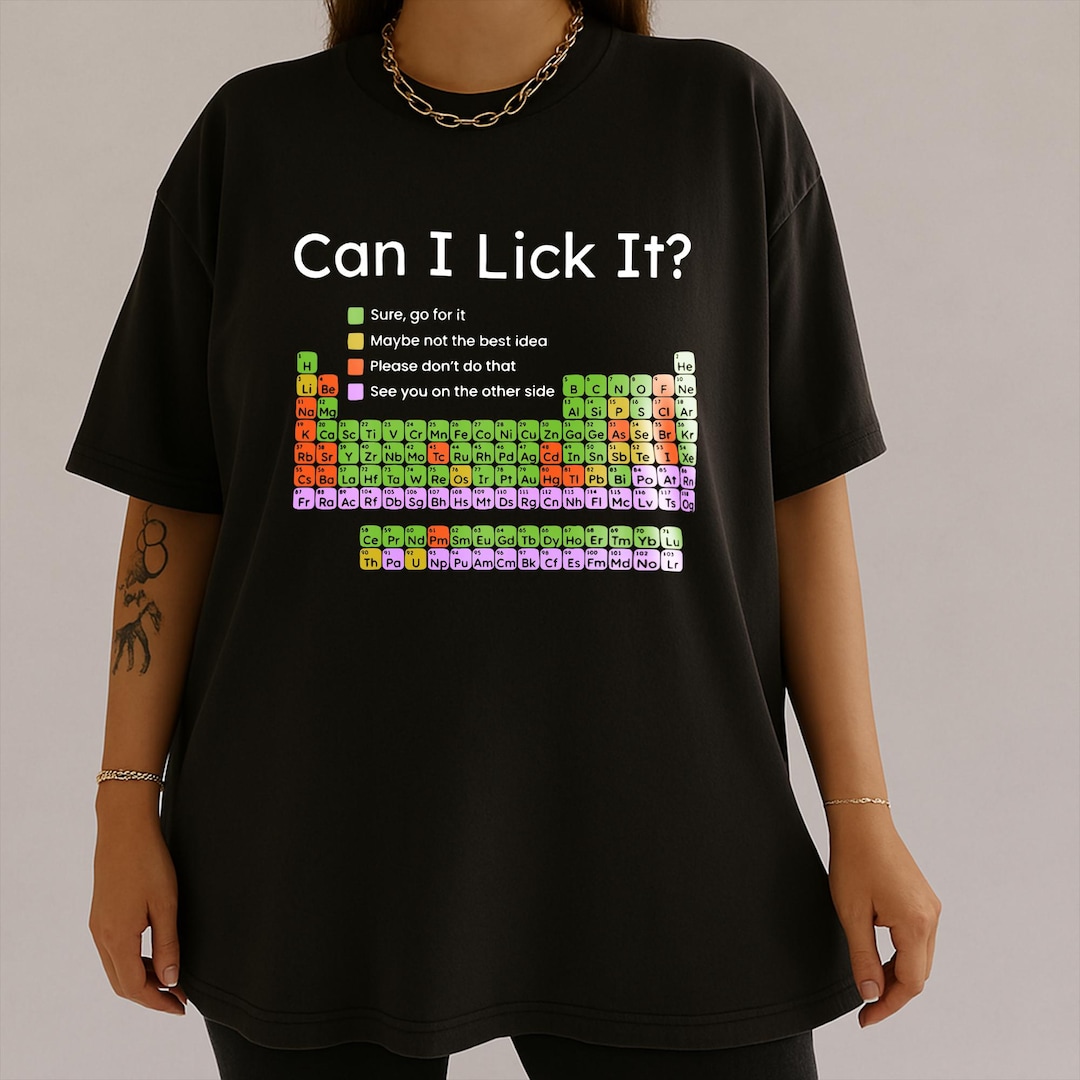 Boah, dieser Hoodie ist ja mal der Hammer für alle Chemie-Fans! Das 'Can I Lick It' Periodensystem Design sorgt garantiert für Lacher und interessante Gespräche.