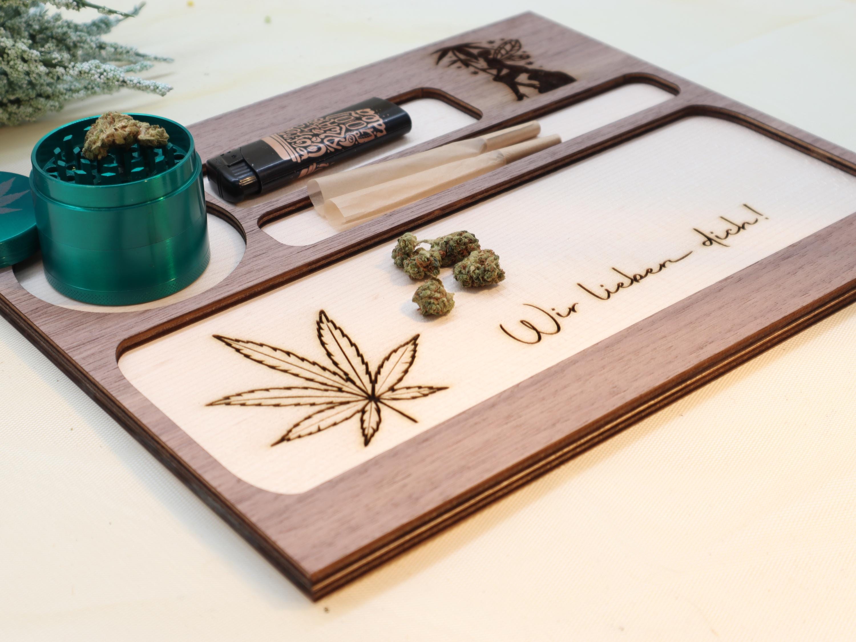 Kräuter-Enthusiasten, dieses personalisierbare Roll Tray aus edlem amerikanischen Nussbaum und Ahorn ist ein echter Hingucker! Mit 330x270x10mm bietet es genug Platz für all eure Utensilien. Das Beste: Ihr könnt es mit eurem Namen, einem besonderen Datum oder individuellem Text personalisieren - in verschiedenen Schriftarten zur Auswahl. Perfekt für den eigenen Gebrauch oder als exklusives Geschenk für gleichgesinnte Freunde. Die hochwertige Verarbeitung garantiert Langlebigkeit und ein tolles Handling. Mehr als nur ein praktisches Tablett - es ist ein Statement für individuellen Style und Entspannung. Ob für CBD-Produkte oder andere Kräuter - dieses Brett macht jedes Roll-Erlebnis zu etwas Besonderem. Elegant, minimalistisch und dabei super funktional. Also, verleihe deinem Hobby die passende Bühne - mit diesem maßgeschneiderten Roll Tray wird jedes Ritual zum Erlebnis!