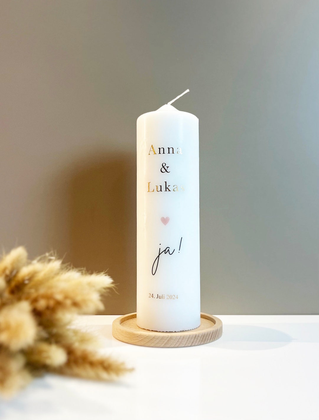 Was für eine wunderschöne persönliche Hochzeitskerze von Herz & Heim! Wird individuell mit den Namen des Brautpaares und dem Hochzeitsdatum bedruckt. Erhältlich in verschiedenen Größen: Größe L (25cm hoch, 8cm Durchmesser) brennt ca. 120 Stunden, Größe M (20cm hoch, 7cm Durchmesser) hält etwa 75 Stunden. Auch als besondere Quader-Form erhältlich. Wähl aus klassischen Motiven wie Tauben, Herzen oder modernen floralen Designs. Optional sogar mit persönlichem Spruch auf der Rückseite. Perfekt für die Trauung im Standesamt oder Kirche, aber auch als bleibende Erinnerung danach. Wird in Thüringen liebevoll gefertigt und binnen weniger Tage versendet. Die weiße Wachskerze wird je nach Motiv einseitig oder beidseitig bedruckt und versiegelt. Ein wirklich besonderes Stück für den schönsten Tag im Leben!