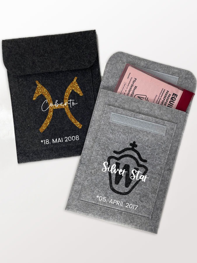 Dein Pferdepass verdient den besten Schutz! Diese stylische Equidenpasshülle aus robustem Polyester-Filz hält alle wichtigen Dokumente sicher zusammen. Maße: 20x26cm - perfekt für Equidenpässe und A5-Unterlagen. Mit praktischem Klettverschluss - nichts verrutscht mehr im Auto oder Sattelschrank. Personalisierbar mit Namen oder Text - mach sie zu deinem ganz persönlichen Accessoire! Ob für Turniere, Tierarztbesuche oder die Aufbewahrung im Stall - immer bestens organisiert. Ein ideales Geschenk für Reiter und Pferdebesitzer. Deutsche Qualität die auffällt und schützt. Zeig deine Pferdeliebe mit Style - bestelle jetzt deine individuelle Passhülle!