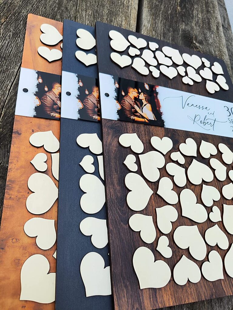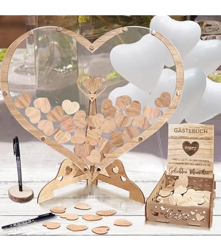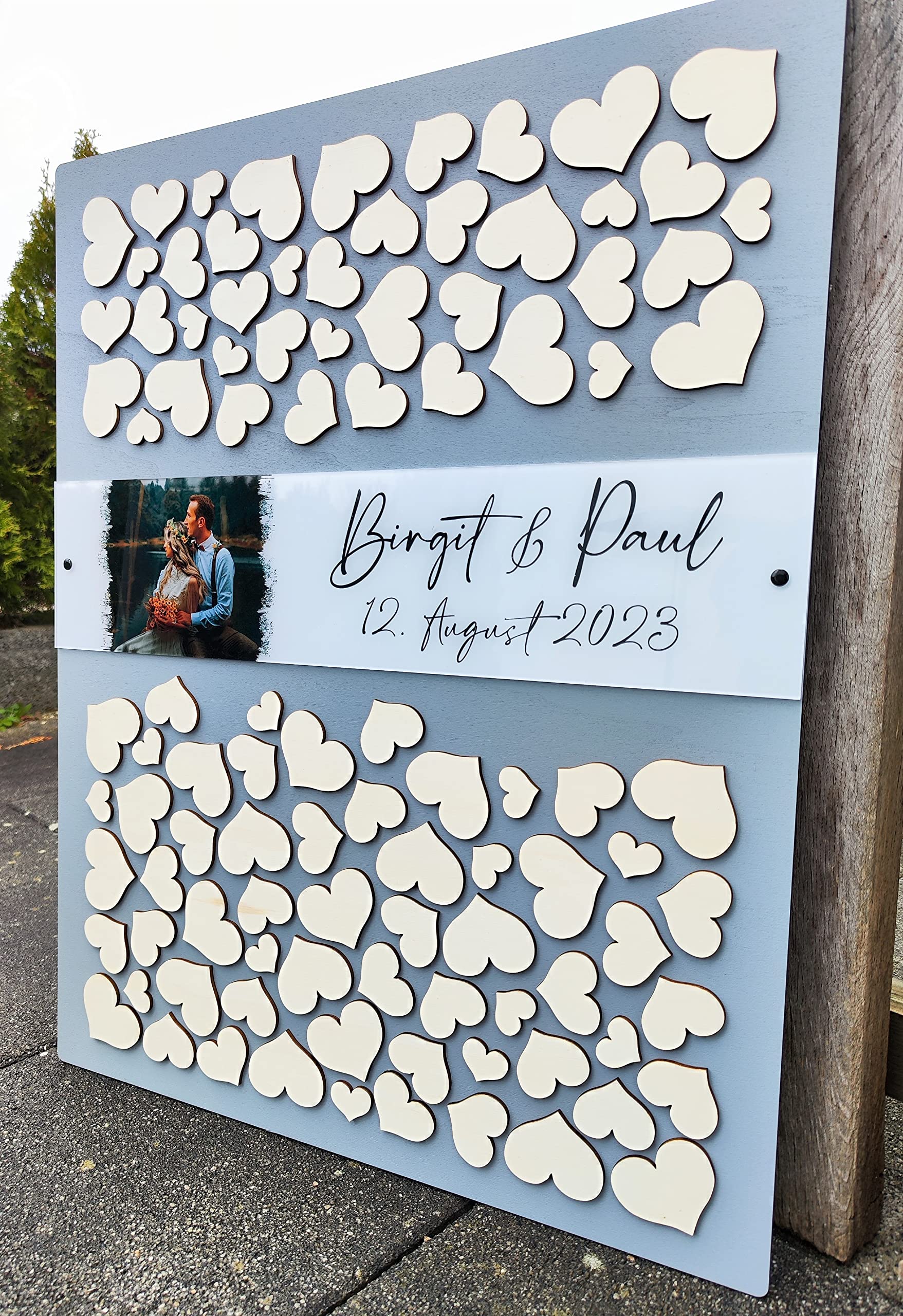 Ein absoluter Hingucker für deine Feier! Dieses personalisierbare 3D-Gästebuch besteht aus 60 Holzherzen auf einer Acrylglas-Platte. Deine Gäste können die Herzen mit Kugelschreibern beschriften - ganz individuell. Maße: 61x42cm, mit 10mm Holzgrundplatte und 4mm starken Herzen. Inklusive Aufhängung für Wandmontage. Hergestellt in Deutschland mit Liebe zum Detail. Perfekt für Hochzeiten, Geburtstage, Taufe oder andere besondere Anlässe. Ein bleibende Erinnerung, die später als Wanddekoration dient! Maße: 61x42cm • Material: Holz & Acryl • Herzen: 60 Stück • Personalisierung: Ja • Herkunft: Deutschland
