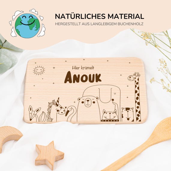 Oh wie süß! Dieses personalisierte Frühstücksbrettchen ist das perfekte Geschenk für Kinder. Aus hochwertigem Buchenholz mit dem Namen deines Kindes und niedlichem Tiermotiv graviert. Perfekt für die Brotzeit, Frühstück oder als Servierbrett für Snacks. Die glatte Oberfläche ist angenehm in der Handhabung und leicht zu reinigen - einfach mit einem feuchten Tuch abwischen. Mit ca. 15x20cm die ideale Größe für kleine Kinderhände. Ob zur Taufe, Geburtstag oder als Überraschung - dieses individuelle Brettchen bringt garantiert ein Lächeln ins Gesicht! Jedes Brett wird handgefertigt und ist ein Unikat. Die Gravur ist tief und haltbar - dein Kind wird noch Jahre Freude daran haben. Umweltfreundlich produziert und langlebig. Mach die Mahlzeiten deines Kindes zu etwas Besonderem mit diesem personalisierten Brettchen! Ein Geschenk das von Herzen kommt und praktisch im Alltag ist.