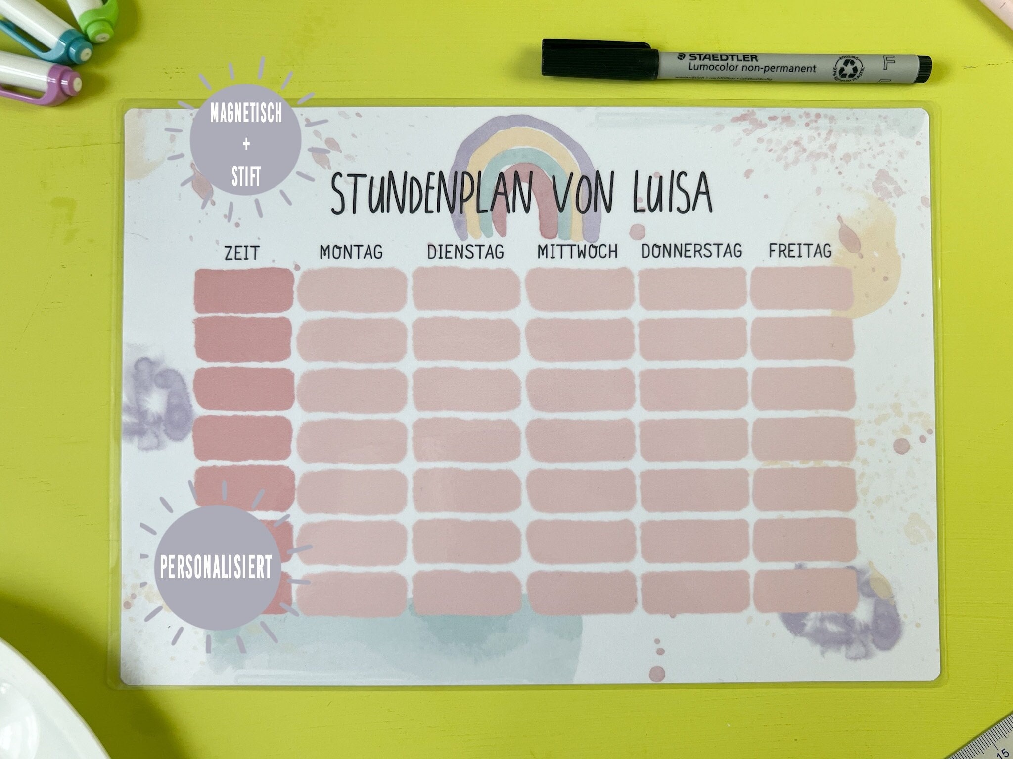 Das Besondere: Dein Kind bekommt seinen eigenen Namen drauf! Einfach beim Kauf angeben und wir drucken den Wunschnamen personalisiert auf den Stundenplan.