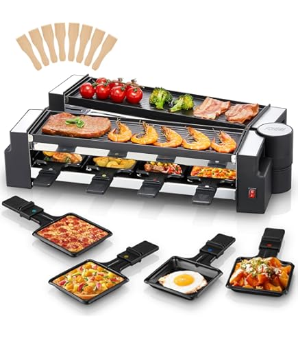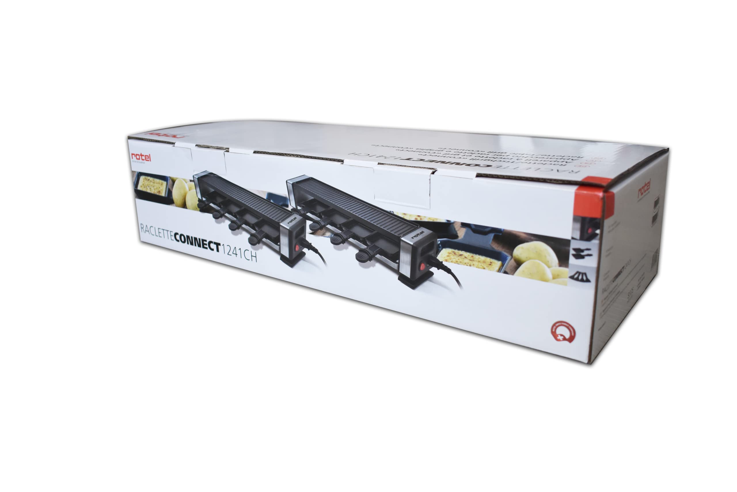 Alter, dieses Rotel Raclette-Set ist ja perfekt für Partys! Zwei Geräte für je 4 Personen, die man zusammenschließen kann - also für bis zu 8 Leute! Kommt mit 8 Pfännchen und 8 Spateln, alles aus Aluguss, Edelstahl und Kunststoff. Maße sind 49,7x10,5x10,1cm pro Gerät, also handlich. Jedes Gerät hat 800W Leistung, heizt also schnell auf. Perfekt für gemütliche Abende mit Freunden oder Familie - einfach Käse, Kartoffeln, Aufschnitt und los geht die Raclette-Party! Ob für zwei separate Tische oder einen großen Tisch - dieses Set ist super flexibel. Einfach mal ausprobieren - Raclette macht einfach immer Spaß! Qualität aus der Schweiz, und das merkt man.