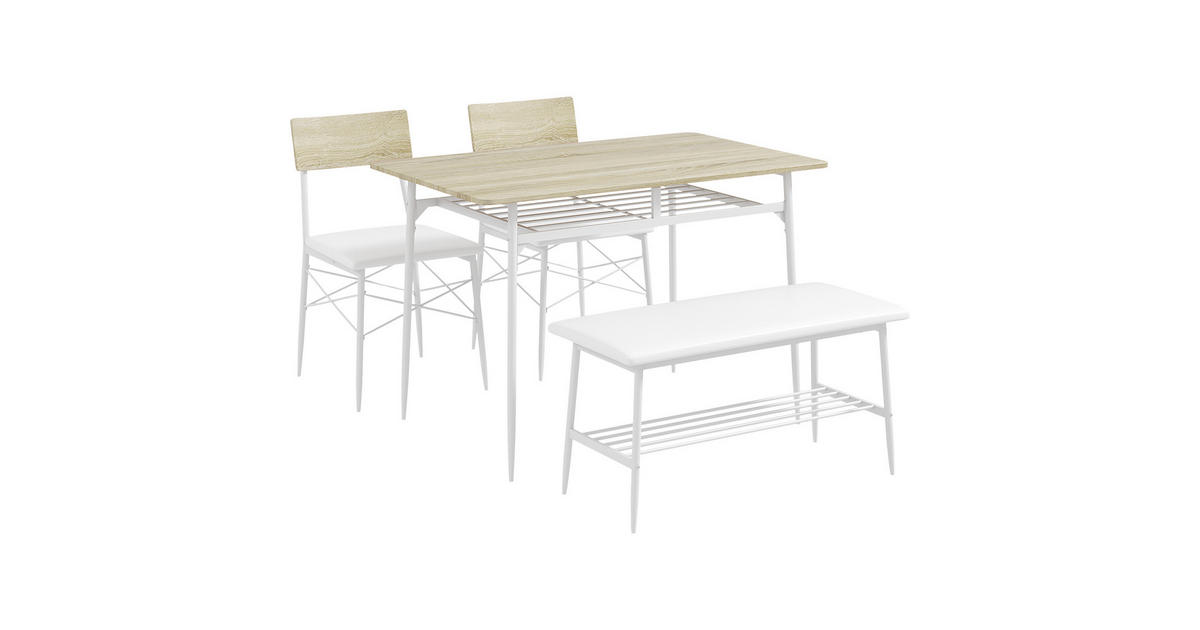 Perfekt für kleine Wohnungen und Häuser! Dieses OPULENTHOME Esstisch Set bringt Stil und Funktionalität in dein Esszimmer. Das Set besteht aus einem 113x70x75 cm großen Tisch, einer 98x27x47 cm Bank und zwei 45x40x86 cm Stühlen - alles im schicken Retro-Design. Die gepolsterten Sitzflächen von Bank und Stühlen sorgen für maximalen Komfort, auch bei langen Essenszeiten. Aus hochwertigem MDF und robustem Stahl gefertigt, ist das Set extrem stabil: Der Tisch trägt 136 kg, Bank und Stühle jeweils 181 kg. Der platzsparende Design ist ideal für beengte Verhältnisse - die Stühle und Bank passen perfekt unter den Tisch. Die wasserfeste Oberfläche macht die Reinigung zum Kinderspiel, und die Montage dauert dank bebilderter Anleitung weniger als 40 Minuten. Ein tolles Set, das Komfort und Stil vereint!