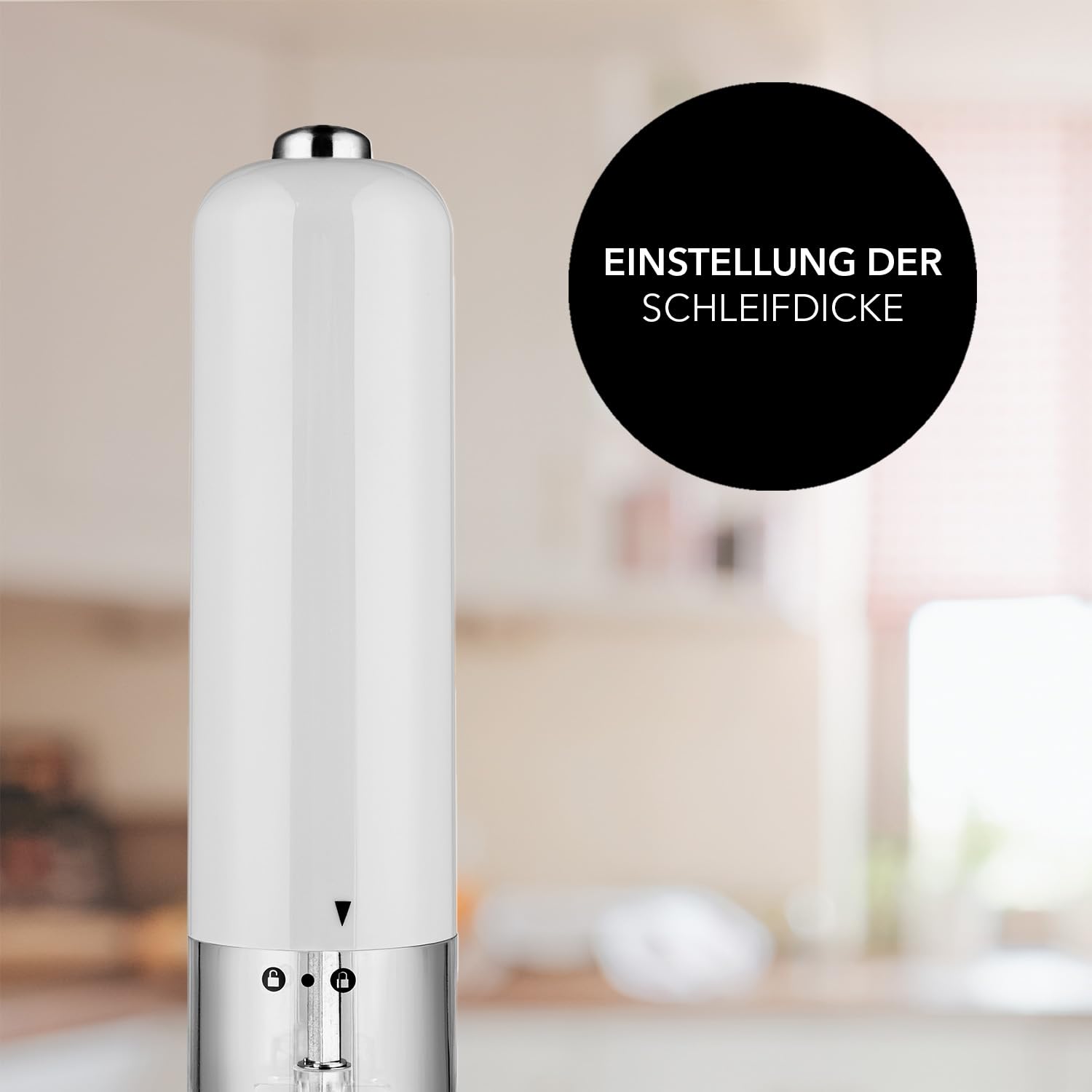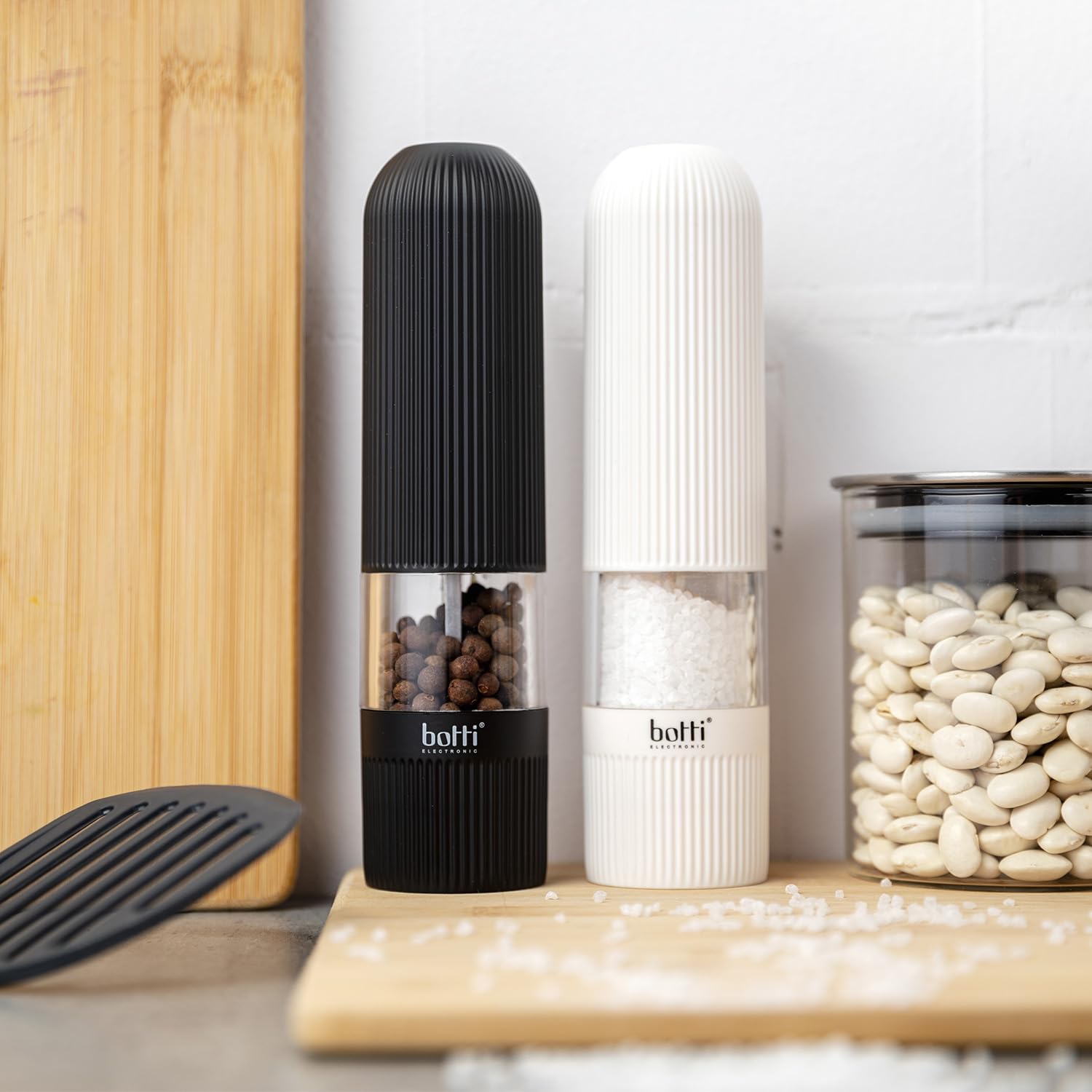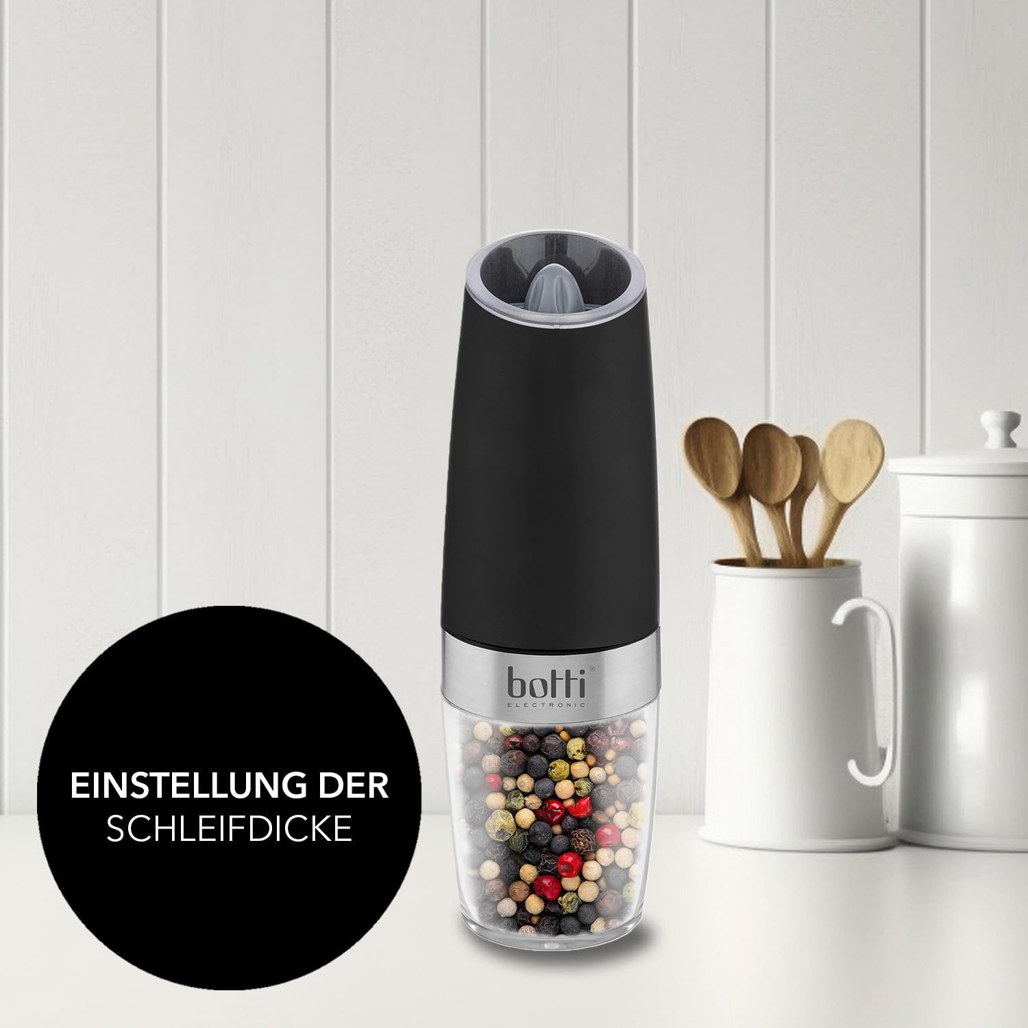Würzen war noch so easy! Die Botti Sorento Mühle mahlt Salz, Pfeffer und andere Gewürze auf Knopfdruck - nein, auf Kippdruck! Einfach um 180 Grad neigen, schon mahlt sie los. Mit einstellbarer Mahlstärke und LED-Licht fürs präzise Dosieren. Keramikmahlwerk, überhitzt die Gewürze nicht - Geschmack bleibt top! Großer Vorratsbehälter, kaum Nachfüllen nötig. In weiß, modernem Design. Einfach abwischbar. Perfekt für alle, die's praktisch und gut aussehend mögen.
