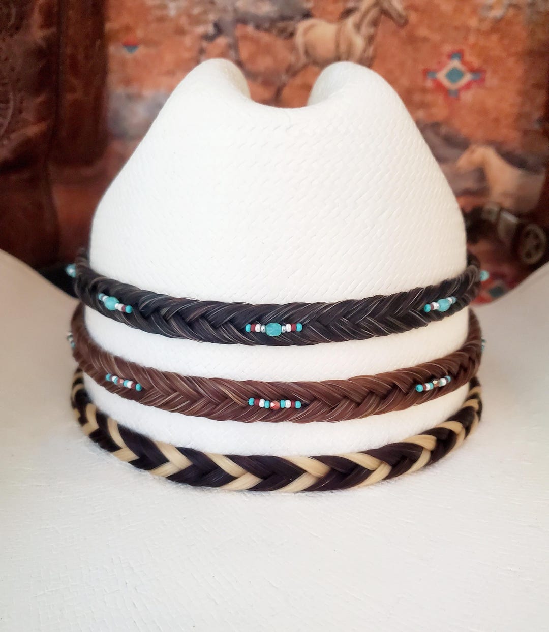 Willst du deinem Westernhut den letzten Schliff verpassen? Dieses atemberaubende Hutband aus echtem Pferdehaar ist genau das Richtige! Handgeflechtet im traditionellen Stil, mit wunderschönen antik-silberfarbenen Beschlägen - einer dreiteiligen Schnalle, Spitze und Mittelschieber. Das 0,95 cm schmale Band gibt deinem Hut sofort diesen authentischen Cowboy-Look. Schwarz und zeitlos elegant passt es zu fast jedem Hut. Perfekt für Western-Fans, die Wert auf echte Handwerkskunst legen. Einfach umlegen, festziehen und du bist bereit für die nächste Ranch-Party oder Country-Veranstaltung. Das Band ist nicht nur schick, sondern auch super stabil - da macht dir so schnell nichts kaputt!