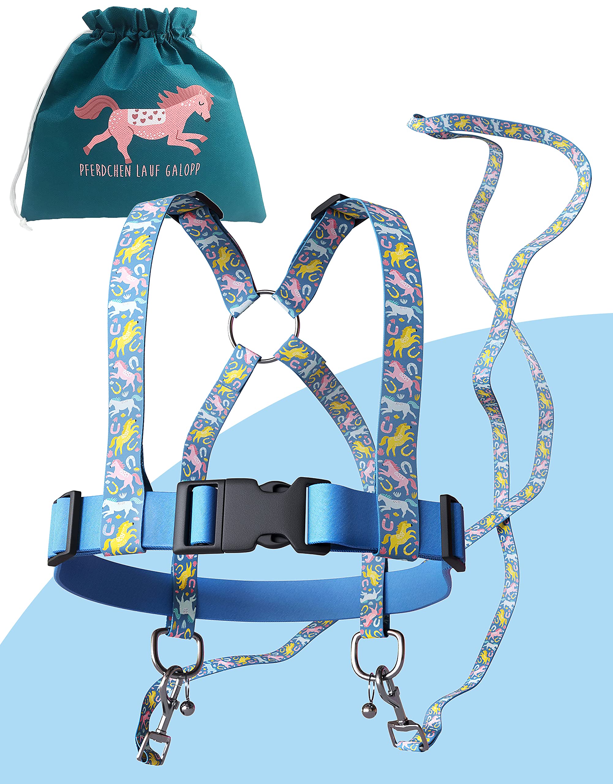 Dein Kind liebt Pferde? Diese beiden süßen Pferdeleinen machen jedes Kind zum glücklichen Reiter! Aus weichem Polyester - hautfreundlich und robust. Der Gurt ist von 45-80 cm verstellbar - passt also lange mit. Mit 1 Meter langer Leine kannst du dein Kind sicher führen. Perfekt für Rollenspiele, Karneval oder einfach zum Toben. Besonders praktisch: Auch als Sicherheitsleine für unterwegs nutzbar! So verlierst du dein Kind nicht in der Menschenmenge. In blauer Farbe - für Jungen und Mädchen gleichermaßen cool. Spiel, Spaß und Sicherheit in einem!