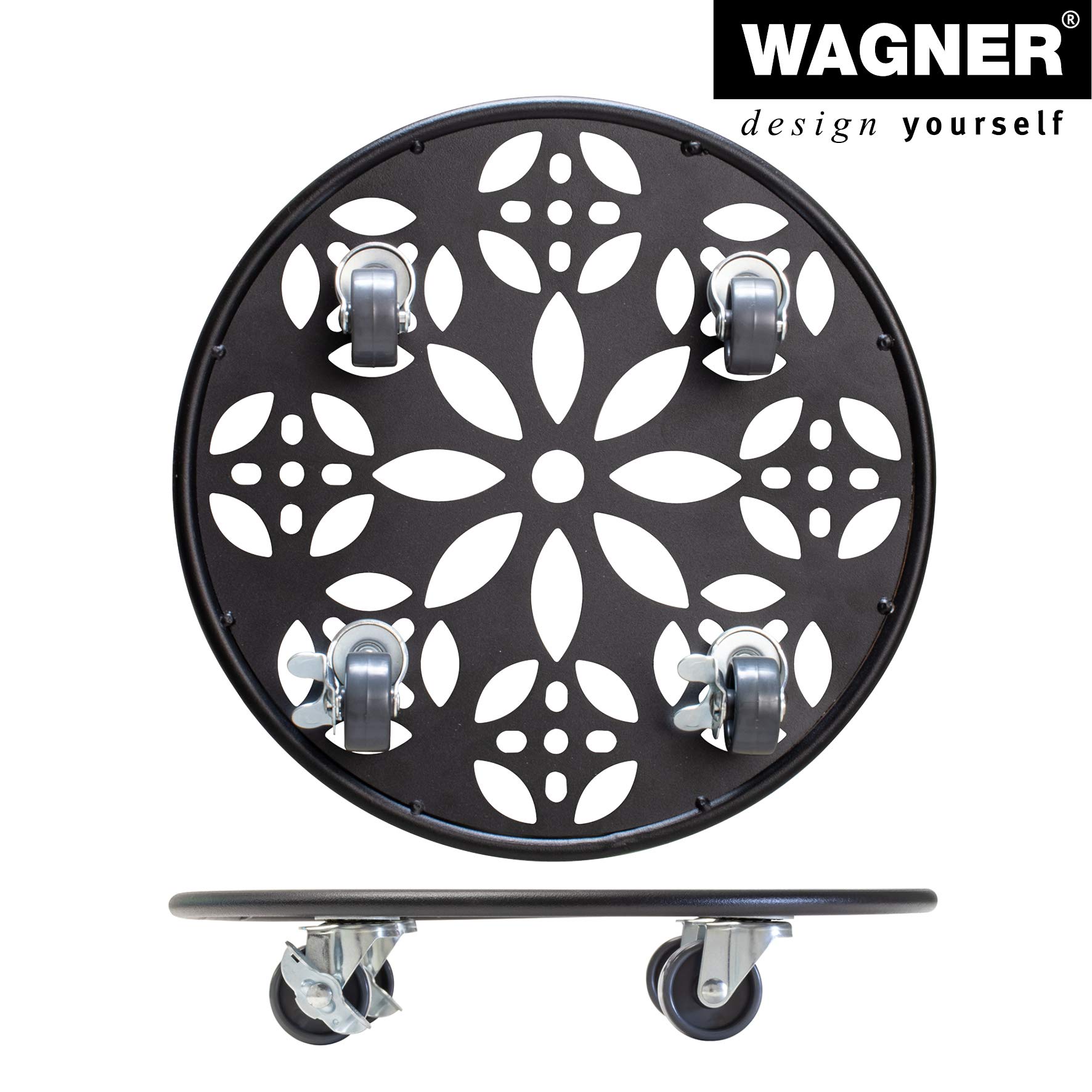 Schwere Blumentöpfe schleppen war gestern! Dieser stylische Pflanzenroller von WAGNER macht das Verschieben deiner Pflanzen zum Kinderspiel. Mit 30cm Durchmesser und 55mm Höhe bietet er genug Platz für die meisten Blumentöpfe. Aus pulverbeschichtetem Stahlblech und bis zu 60kg tragfähig - da kannst du auch richtig schwere Pflanzen draufstellen. Die vier Lenkrollen (35mm Durchmesser) laufen super leicht und zwei haben Feststellbremsen, damit der Roller nicht wegrollt. Das schwarze Design mit den dekorativen Ethno-Mustern sieht einfach klasse aus. Perfekt für innen und außen - ob auf Terrasse, Balkon oder im Wohnzimmer. Einfach Topf drauf, schieben und schon steht die Pflanze am richtigen Platz. So kannst du deine Pflanzen je nach Sonnenstand einfach umpositionieren. Made in Germany - Qualität, die man sieht und spürt. Endlich kein Rückenschmerzen mehr vom Pflanzenschleppen!