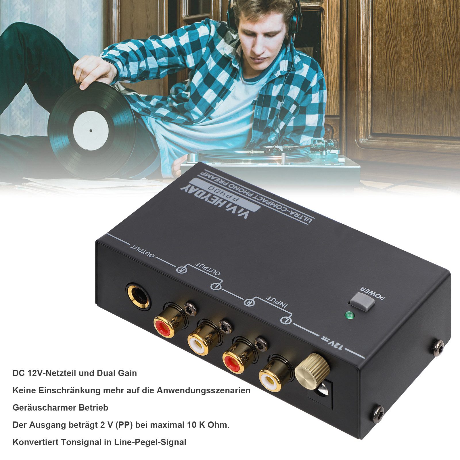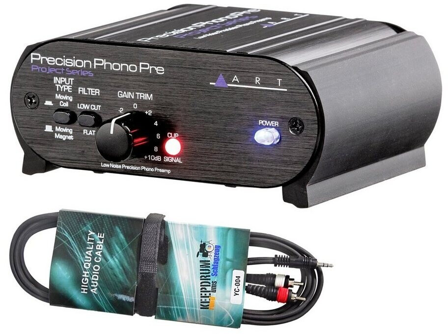 Für alle Vinyl-Fans ist dieser Phono Preamp genau das Richtige! Damit kannst du deinen Plattenspieler an jede Stereoanlage oder PA-Anlage anschließen. Der ART Precision Phono Preamp hat ne super geringe Rauschbildung und variable Vorverstärkung - da klingt deine Platte gleich viel klarer. Er funktioniert mit beiden Tonabnehmer-Typen: Moving Coil und Moving Magnet. Der zuschaltbare Low-Cut-Filter entfernt Störgeräusche und Rumpeln, und die Signal/Clip-Anzeige hilft dir, die Lautstärke im Blick zu behalten. Im Lieferumfang ist alles dabei: Der Vorverstärker, Netzteil und sogar ein keepdrum Audiokabel (3,5m Miniklinke auf 2x Cinch). Kompakt, robust und perfekt für DJs und Heim-Anlagen!