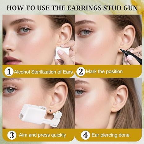 Oh je, Ohrlöcher stechen war noch nie so einfach! Dieses Set hat 4 Einweg-Ohrlochpistolen mit integrierten 4mm CZ Steinchen in Gold. Alles steril verpackt und ready to use! Dazu gibt's 4 UV-Piercing-Pads gegen Entzündungen. Die Pistolen sind nur 2,25 Zoll lang - handlich und einfach zu bedienen. Einfach ans Ohr halten, festdrücken (nicht zögern!) und schon ist das Ohrloch da! Wenn du's nicht selbst schaffst, lass dir von Familie oder Freunden helfen. Total sicher und hygienisch, alles in einem Schritt. Perfekt für zu Hause - kein teurer Piercer-Besuch nötig! Auch super als Geschenk für Freundinnen. Mit den süßen Gold-Steinchen sehen die Ohrringe sofort stylisch aus. Hol dir das Set und mach dir (oder anderen) endlich die ersehnten Ohrlöcher!