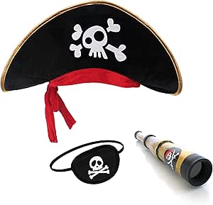 Ahoy, junge Piraten! Dieses komplett 5-teilige Piratenkostüm-Set macht jedes Kind zum waschechten Seeräuber. Enthalten ist alles, was man braucht: ein cooler Piratenhut, eine Augenklappe mit verstellbarem Gummiband, ein stylisches Kopftuch, eine coole Weste mit Klettverschluss und echte Piraten-Ohrringe. Die Materialien sind hochwertig und kindgerecht - bequem zu tragen und halten auch wildeste Abenteuer aus. Perfekt für Halloween, Karneval, Kindergeburtstage oder einfach zum Spielen. Das Design mit Totenkopf-Mustern und goldenen Details sieht einfach authentisch aus. Fördert die Kreativität und macht Riesenspaß beim Rollenspiel. Einfach anziehen und schon kann die Piraten-Party losgehen! Ob für Jungen oder Mädchen - hier werden Kinderaugen garantiert leuchten.