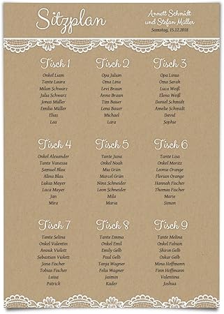 Organisiere deine Hochzeitsgäste mit Stil! Dieses wunderschöne Sitzplan-Plakat im Vintage-Design mit zartem Brautpaar-Motiv ist der perfekte Weg, um deinen Gästen zu zeigen, wo sie sitzen. Im großzügigen DIN A3 Format (420x297mm) auf hochwertigem 300g/qm Papier gedruckt. Vollständig individuell bedruckt mit allen Gästennamen und Tischnummern - wir passen das Layout genau an deine Tischanzahl an. Kein lästiges Selberbasteln oder Drucken - einfach uns die Daten geben und wir erledigen den Rest. Lieferung bereits 1-2 Tage nach Druckfreigabe! Sieht nicht nur super aus, sondern sorgt auch für reibungslose Sitzordnung auf deiner Feier. Passt perfekt zu unserem weiteren Hochzeitspapeterie-Sortiment. Mach deine Hochzeit unvergesslich mit diesem personalisierten Highlight!