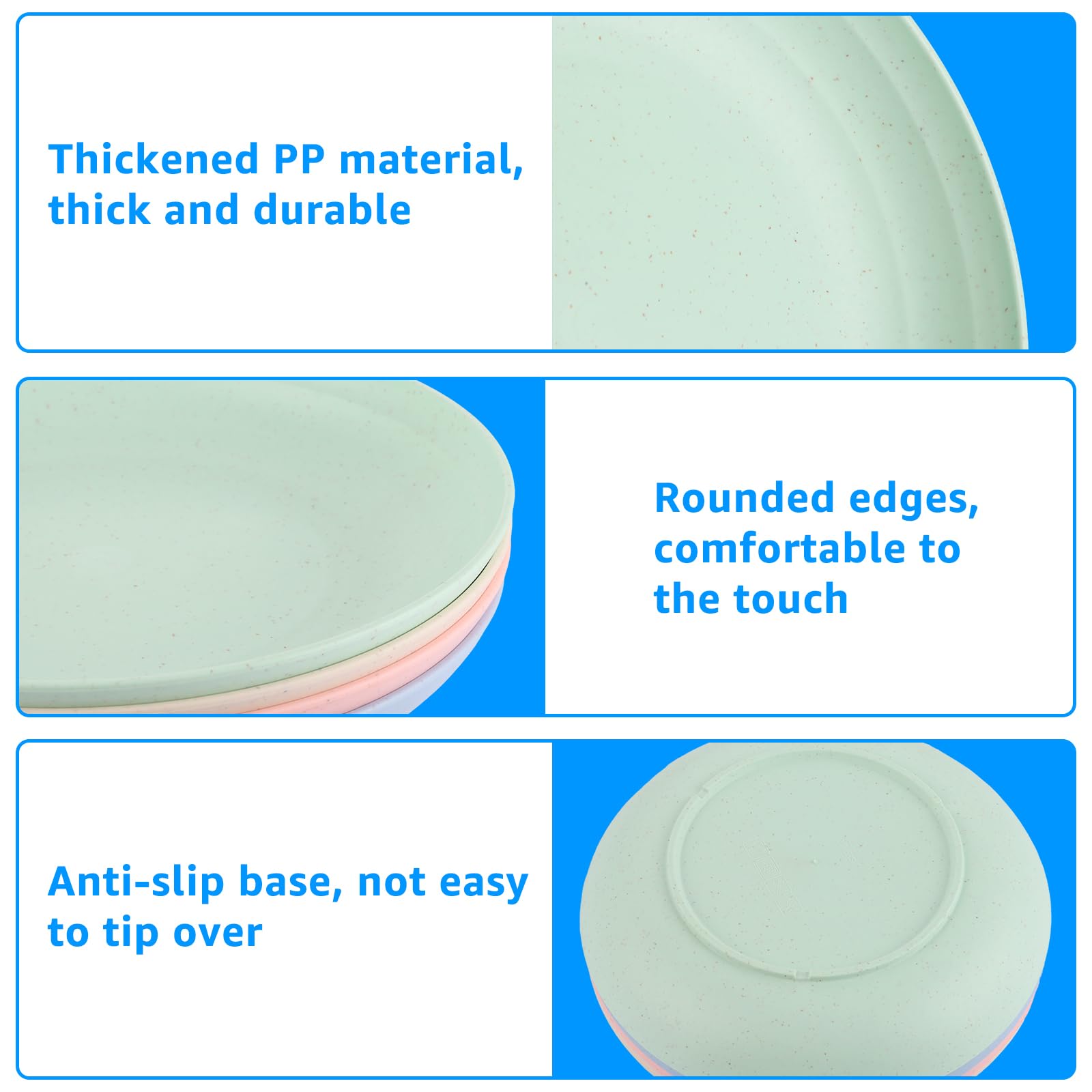 Perfekt für dein nächstes Picknick oder die Gartenparty! Diese bunten Plastikteller sehen nicht nur hübsch aus, sondern sind auch mega praktisch. \\n\\nWas ich an ihnen liebe: \\n• Es gibt 4 verschiedene Farben - blau, rosa, beige und grün \\n• Jeder Teller hat 20 cm Durchmesser - ideal für Hauptgerichte \\n• Die Unterseite ist rutschfest - kein Umkippen mehr! \\n• Super leicht und stapelbar \\n\\nDas Material ist PP-Kunststoff - das bedeutet: \\n• Hält heiße Speisen aus \\n• Kann in die Mikrowelle \\n• Spülmaschinenfest \\n• Bricht nicht so leicht \\n• Lebensmittelecht und ungiftig \\n\\nWo du sie überall einsetzen kannst: \\n• Beim Camping und Picknicken \\n• Auf Kindergeburtstagen \\n• Beim Grillen im Garten \\n• Für Familienfeiern \\n• In der Kantine oder Mensa \\n\\Toll für unterwegs: \\n• Leicht zu transportieren \\n• Nehmen kaum Platz weg \\n• Können mehrmals verwendet werden \\n• Einfach zu reinigen \\n\\nReinigung ist kein Problem: \\n• Einfach in die Spülmaschine \\n• Oder per Hand mit Spülmittel \\n• Trocknen schnell \\n• Bleiben schön farbig \\n\\nIm Set sind 12 Teller enthalten - genau richtig für eine größere Runde. Durch die verschiedenen Farben kann jeder Gast 'seinen' Teller leicht wiedererkennen. \\n\\nTipp: Die Teller eignen sich super für Salate, Nudelgerichte, Kuchen oder einfach für Snacks. Der 2,5 cm hohe Rand verhindert, dass etwas daneben geht. \\n\\nOb drinnen oder draußen - diese Teller machen einfach immer eine gute Figur! Und falls mal einer kaputt geht - kein Problem, du hast ja mehrere.