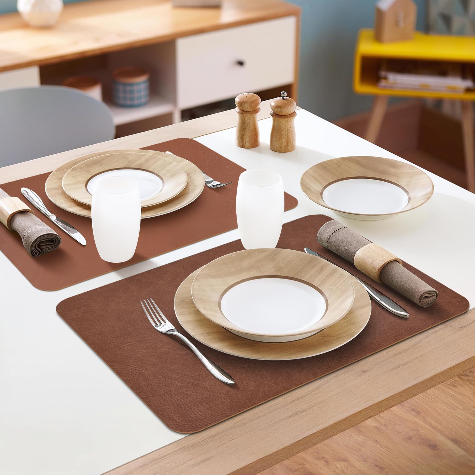 Wow, diese Amber&Bee Platzsets sehen aus wie echtes Leder - sind aber viel praktischer! Im 6er-Set bekommst du alles, was du für deinen Esstisch brauchst. Jedes Set misst 44,5 x 30 cm - perfekt für Teller, Tassen und Schüsseln. Die fein strukturierte Oberfläche in Amber Brown sieht richtig edel aus und wertet jede Tafel auf. Aber das Beste: Sie sind wasserfest, pflegeleicht und rutschfest! Einfach mit einem feuchten Tuch abwischen und sie sehen wieder aus wie neu. Die spezielle Anti-Slip-Rückseite verhindert, dass Teller und Gläser verrutschen. Aus schadstofffreien Materialien ohne BPA, Blei oder Cadmium - absolut sicher für den täglichen Gebrauch. Ob fürs gemütliche Frühstück, festliche Dinner oder einfach für den Alltag - diese Sets schützen deine Tischplatte und sehen dabei fantastisch aus. Nachhaltig und wiederverwendbar - besser als Einweg-Sets!