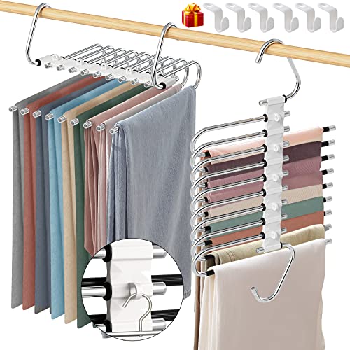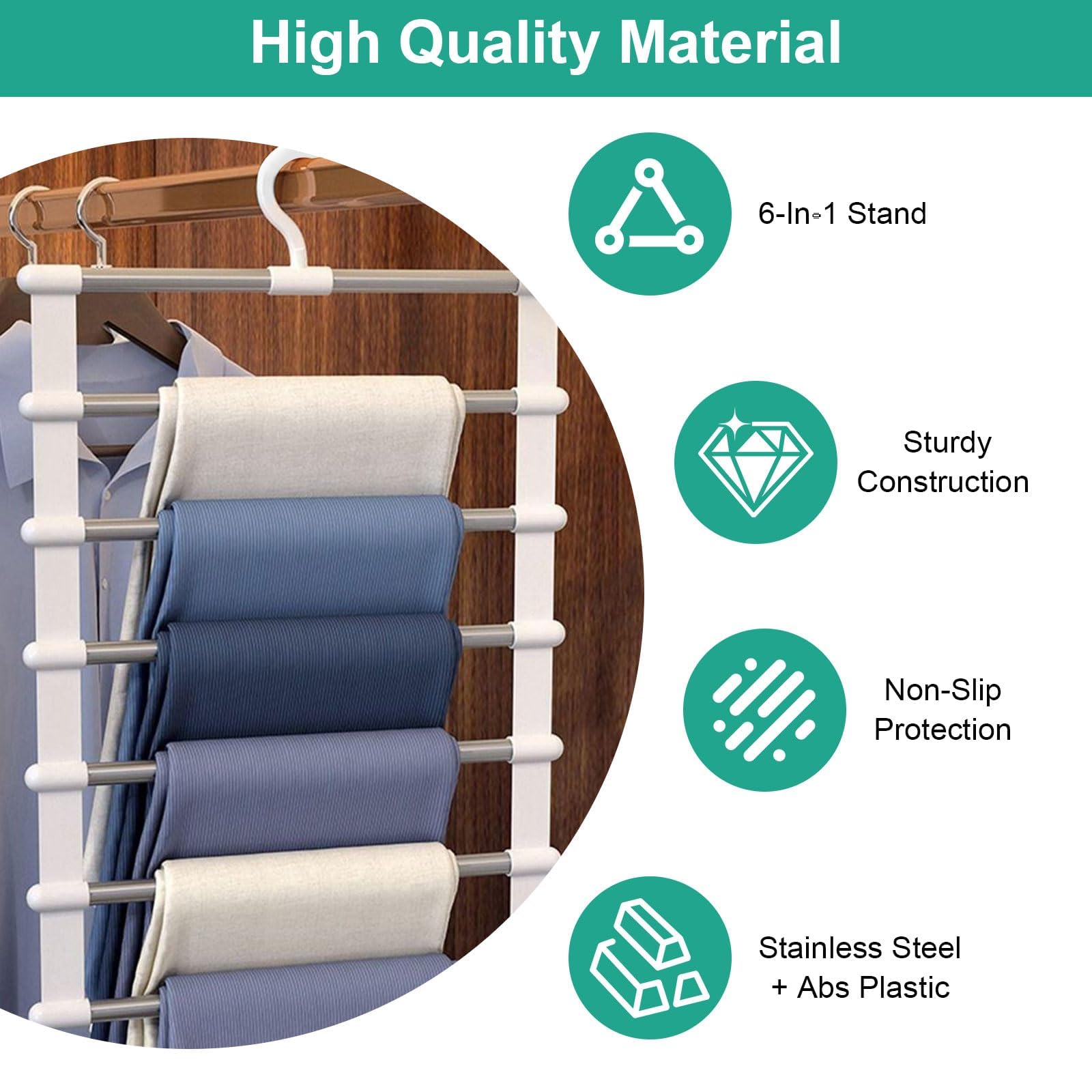 Wow, mit diesen Hosenbügeln wird dein Kleiderschrank endlich ordentlich! Das 2er-Set ist total praktisch und spart unglaubliche 80% Platz. Kein Chaos mehr beim Suchen deiner Lieblingshosen!\n\nJeder Bügel hat 6 einzelne Aufhänge-Ebenen - perfekt für Hosen, Röcke, Schals, Krawatten und sogar Handtücher. Die vernünftigen Abstände verhindern Knitterfalten.\n\nAus hochwertigem Edelstahl und ABS-Kunststoff - rostfrei, stabil und langlebig. Die weiße Farbe sieht immer sauber und modern aus.\n\nSuper einfach zu montieren, ganz ohne Werkzeug. Einfach entfalten, aufhängen und fertig! Wenn du sie nicht brauchst, klappst du sie zusammen - nur 3 cm dick!\n\nIdeal für zu Hause, Wohnheim, Hotel oder Boutique. Endlich Schluss mit dem Kleiderchaos - alles griffbereit und übersichtlich!