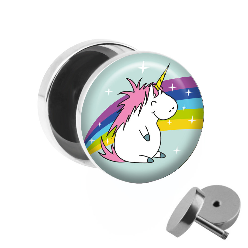 Alter, dieser Einhorn Fake Plug ist einfach nur wow! Aus hochwertigem 316L Chirurgenstahl - also absolut nickelfrei und für Allergiker geeignet. Das süße Einhorn-Motiv mit Regenbogen und Wolken macht einfach Laune! Maße: 10mm Plattendurchmesser, 1,2mm Stabdicke, 6mm Abstand zwischen den Platten. Super einfach zu tragen - einfach die Rückseite abschrauben, durchs Ohrloch und wieder festschrauben. Sieht aus wie ein großer Tunnel, braucht aber nur normales Ohrloch! Perfekt für Partys, Alltag oder als Statement-Schmuck. Ob für Mädels oder Jungs - Einhörner sind einfach im Trend! Ein absoluter Hingucker der garantiert Komplimente bringt. Zeig deine individuelle Seite mit diesem coolen Schmuckstück! Einfach bestellen und stylisch aussehen!
