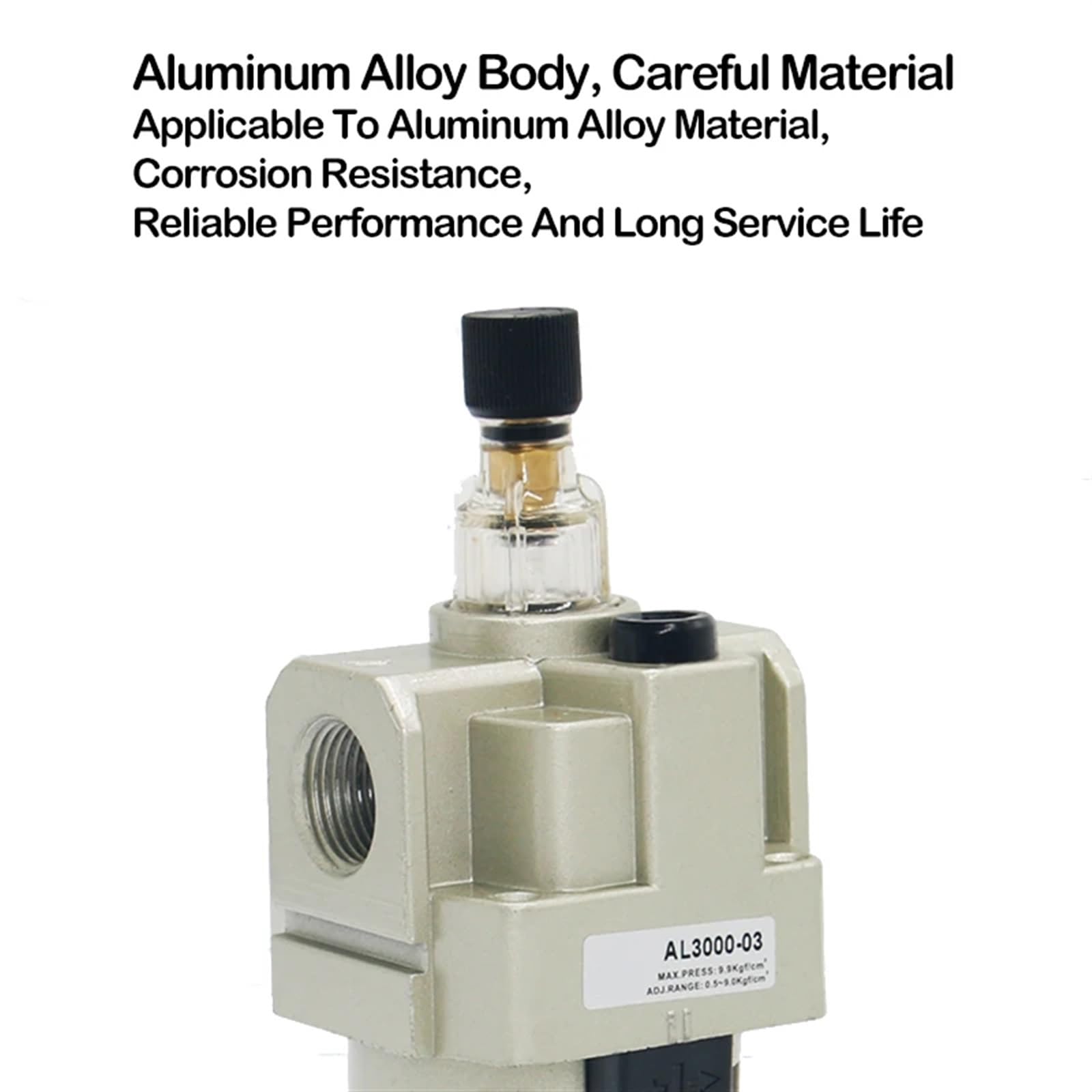 Professionelles pneumatisches Luftöler für Industrie und Werkstatt! Der AL3000-03 ist ein echter Alleskönner für deine Druckluft-Anlage. 3/8 Zoll Anschluss, 1700 l/min Durchfluss - da kommt was bei rum! Einstellbarer Druckbereich von 0,5-9,0 kgf/cm², hält bis 15,0 kgf/cm² aus. Gehäuse aus Aluminium - robust und langlebig. Arbeitet bei 5-60°C - also für die meisten Einsätze geeignet. Perfekt für alle die mit Druckluft arbeiten und ihre Geräte optimal schmieren wollen. Wenn du Wert auf professionelle Ausrüstung legst, ist dieses Luftöler genau das Richtige!