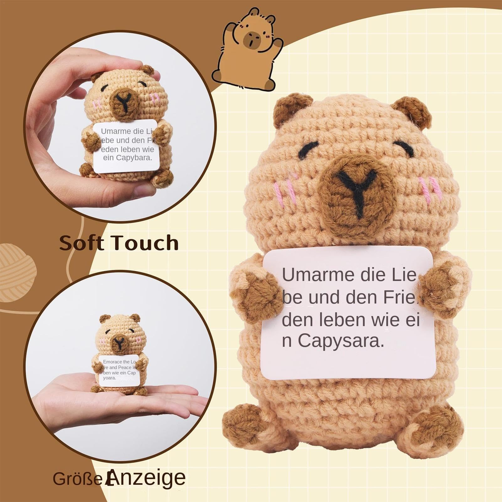 Manchmal braucht man einfach eine Umarmung - und dieses süße gehäkelte Capybara ist genau das! Handgefertigt aus weichem, hochwertigem Garn fühlt es sich super kuschelig an. Das niedliche Design mit freundlichem Gesicht erinnert an Faultiere oder Schildkröten und macht einfach glücklich. Perfekt als emotionaler Begleiter in schwierigen Zeiten - ob für Krebspatienten, gestresste Kollegen oder einfach als Mutmacher für zwischendurch. Jedes Capybara ist ein Unikat, liebevoll gehäkelt und voller Charakter. Super als Abschiedsgeschenk für Kollegen, zu Weihnachten, Geburtstag oder einfach so. Passt in jede Tasche - dein persönlicher Pocket Hug für unterwegs! Wird schnell zum Gesprächsstoff und symbolisiert Verbundenheit und Zuwendung. Mehr als nur ein Spielzeug - eine kleine Portion Trost und Wärme für alle, die sie brauchen.